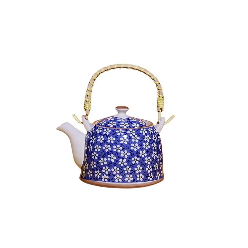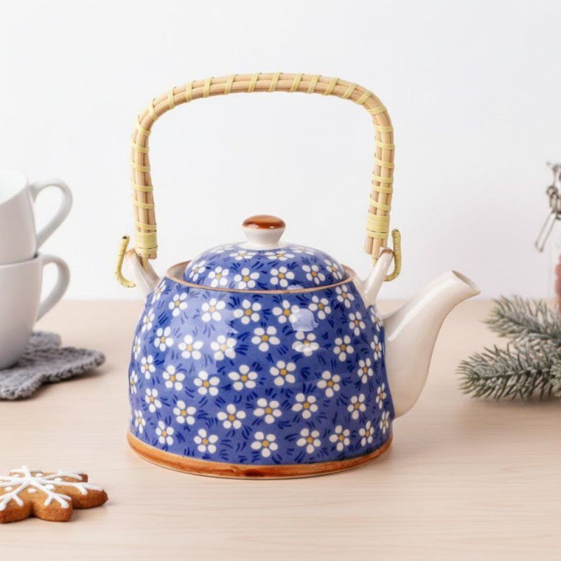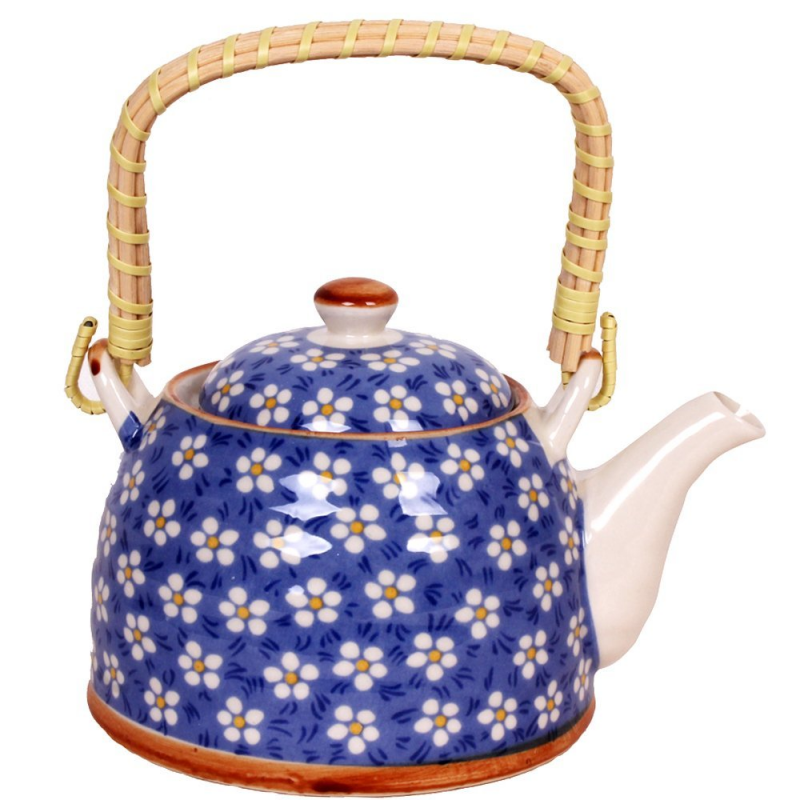 ✅ ابريق شاي بورسلان مع مصفاة لون أزرق مورد أبيض