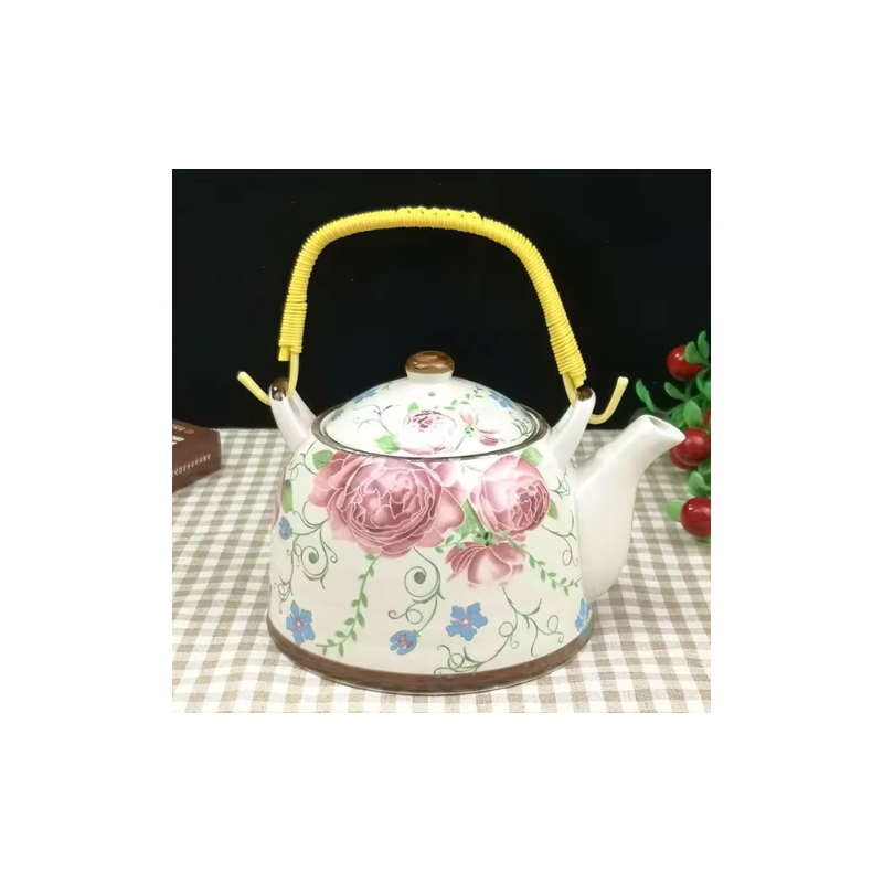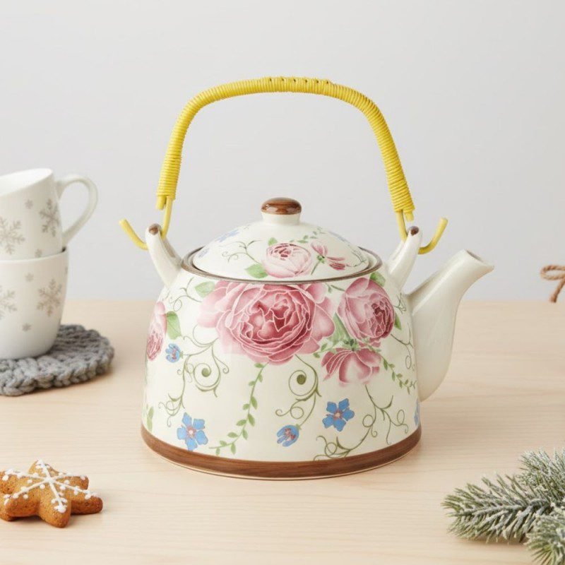 ✅ ابريق شاي بورسلان مع مصفاة لون طحيني مورد خمري
