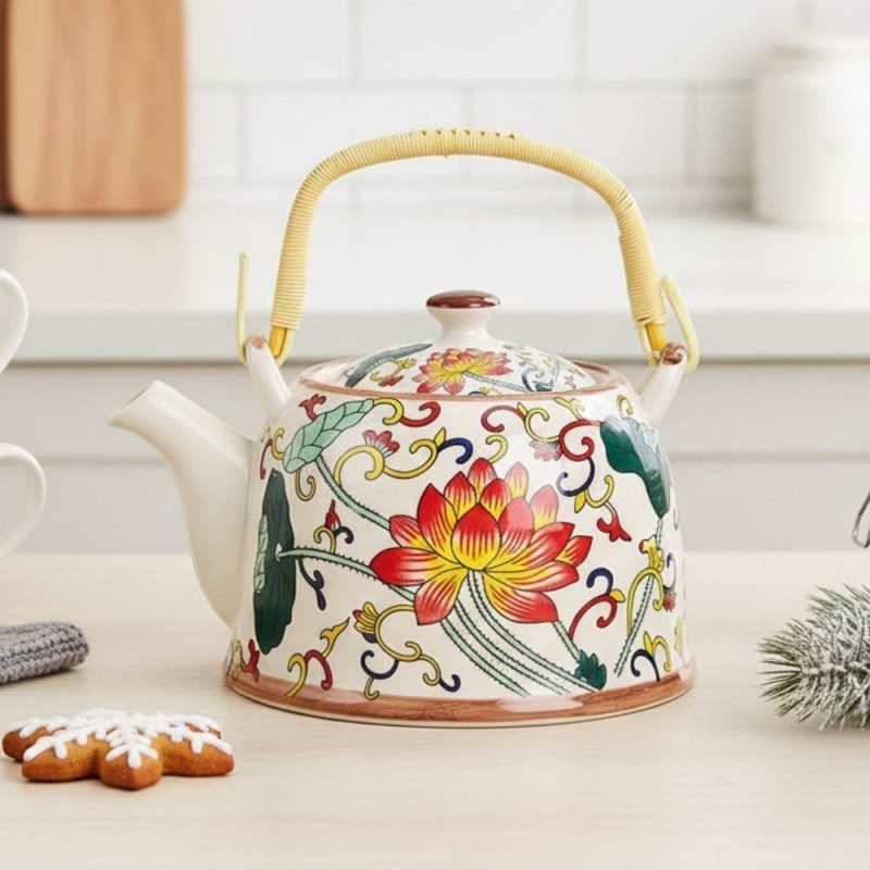✅ ابريق شاي بورسلان مع مصفاة لون طحيني مورد برتقالي