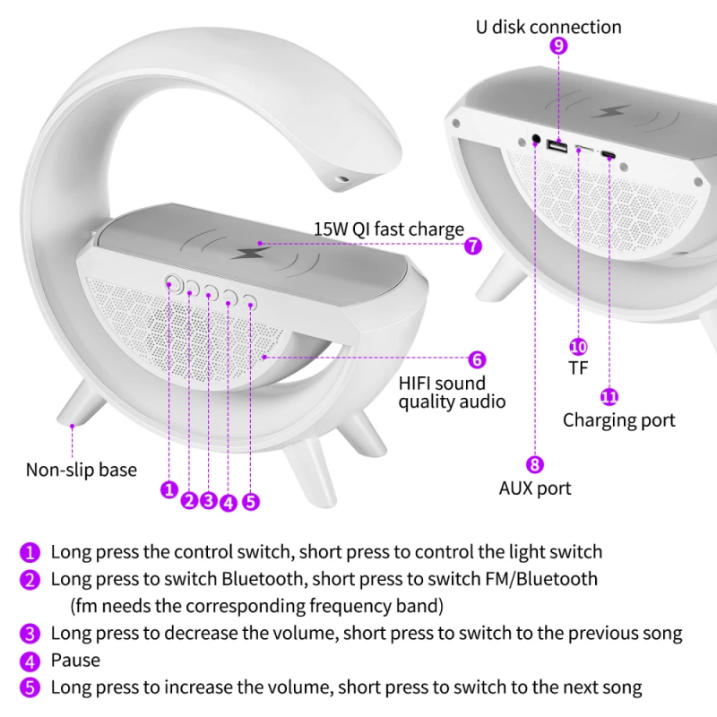مصباح طاولة متعدد الاستخدامات بتصميم عصري جذاب يجعله إضافة جميلة، كما أنه مزود بسماعة بلوتوث مدمجة بالإضافة إلى الشحن اللاسلكي. إنه ليس فقط مصباح طاولة بجانب السرير، ولكنه يحتوي أيضًا على شحن لاسلكي سريع، ومكبر صوت بلوتوث، ومصباح نوم، ومصباح إيقاظ شروق الشمس، ومصباح جو. مصباح طاولة قابل لتعديل الضوء انقر فوق زر المصباح للتبديل بين 10 أوضاع ألوان فاتحة. يمكن تعديل 256 وضعًا آخر و16 مليون لون ضوئي من خلال التطبيق المرتبط. يمكن ضبط سطوع الضوء بشكل لا نهائي، وسيصبح الضوء أكثر سطوعًا أو أغمق تدريجيًا. شاحن لاسلكي سريع سرعة الشحن لمصباح غرفة النوم هذا أسرع بكثير مما يمكن. يمكنك استخدام هذا المصباح في أي مكان تحتاج فيه لشحن هاتفك المحمول. الإضاءة المحيطة مهرجان لا بد منه تعمل الأقواس مع 10 تأثيرات إضاءة ديناميكية مختلفة، لمساعدتك على خلق أي حالة مزاجية تريدها. هدية مثالية للديكور الجمالي للغرفة