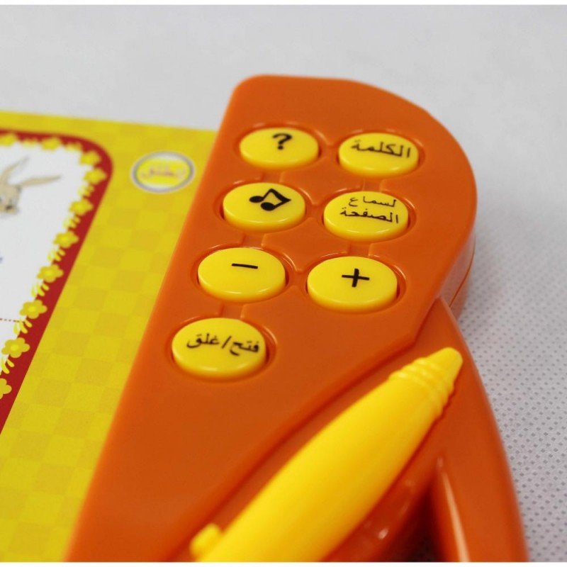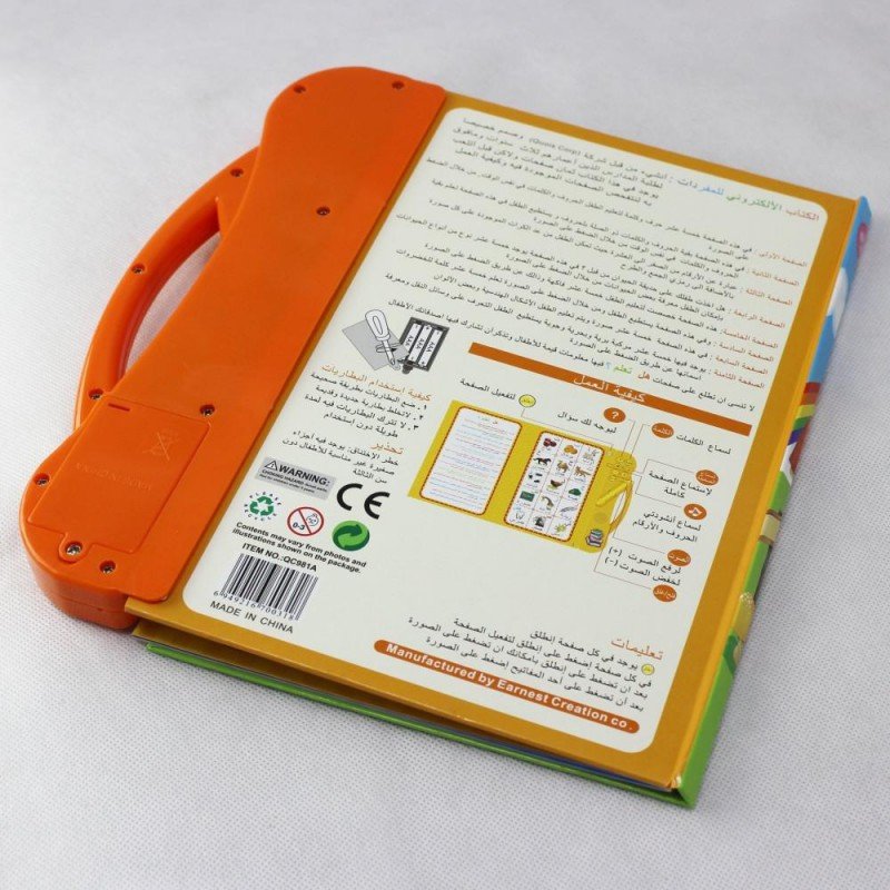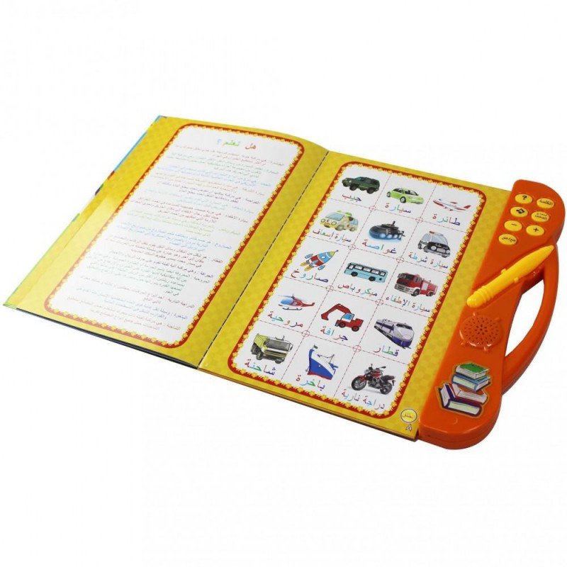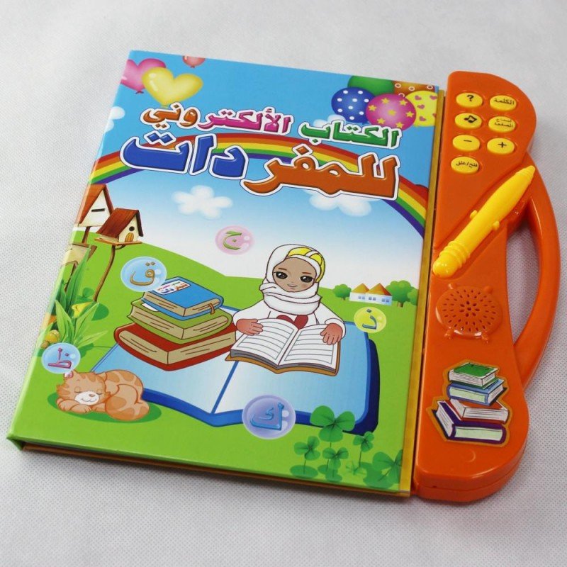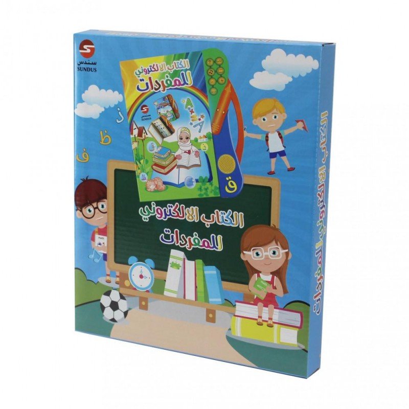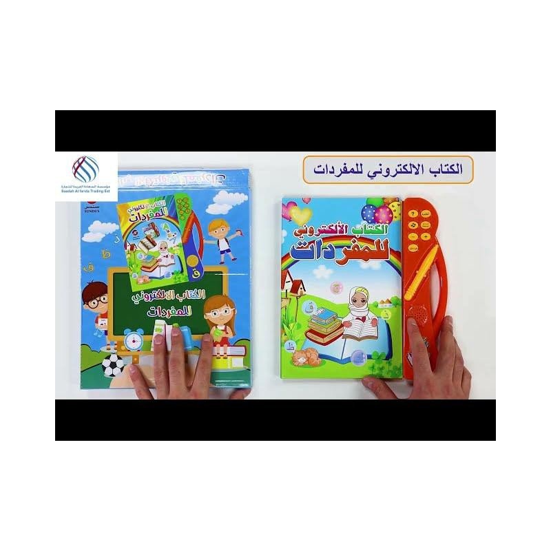 الكتاب الالكتروني للمفردات وهو عبارة عن كتاب يحتوي على بعض الكلمات والحروف العربية بمجرد الضغط عليها بالقلم يتكلم الكتاب تلقائياً وهذا يعين الطفل على معرفة النطق السليم للكلمة