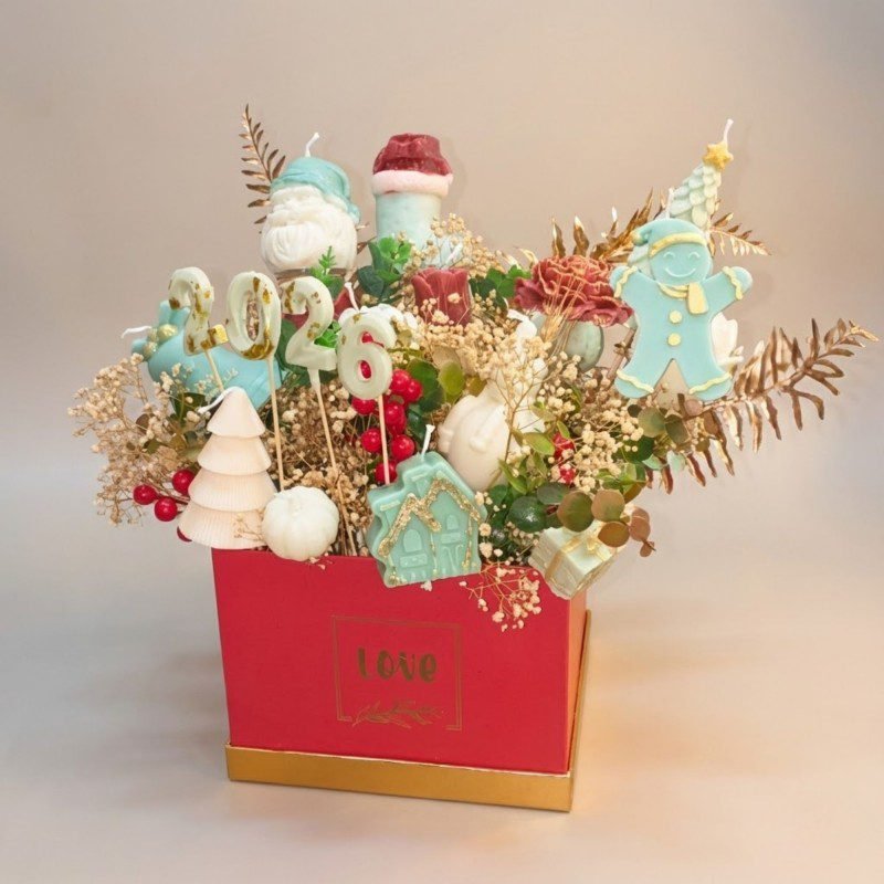 باقة كريسماس فخمة بتنسيق غني ومليء بالتفاصيل، مصممة للاحتفال برأس السنة 2026 بأسلوب أنيق ودافئ. تجمع بين الشموع المعطّرة بأشكال كريسماس مميزة والورود المجففة مع بوكس أنيق، لتكون قطعة ديكور لافتة أو هدية راقية تعبّر عن الذوق العالي.
