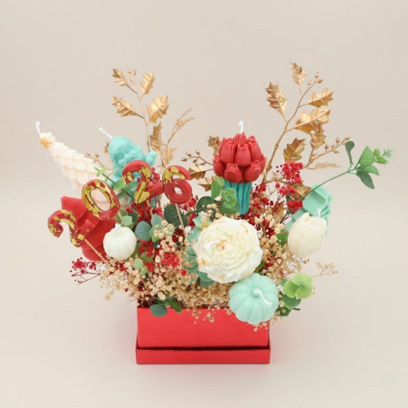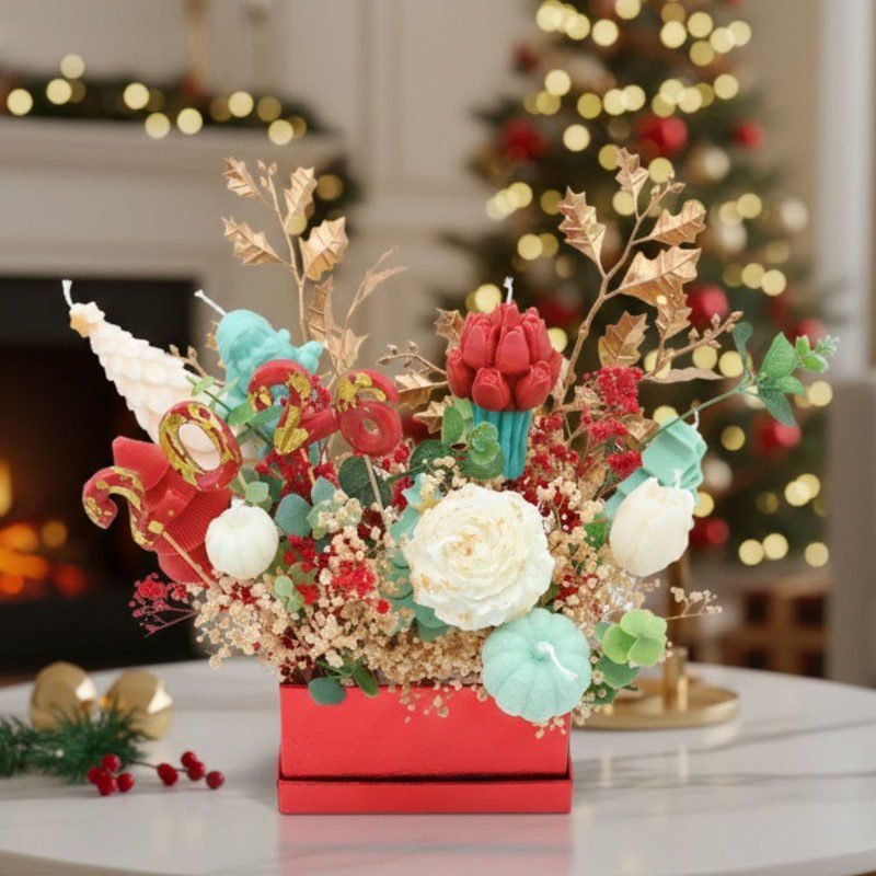 باقة كريسماس أنيقة بتصميم دافئ ومبهج، تجمع بين الشموع المعطّرة بأشكال كريسماس مميزة مع شموع رقم 2026 وتنسيق فاخر من الورد المجفف داخل بوكس أحمر أنيق. مثالية لإضفاء أجواء احتفالية راقية على المكان أو كهدية مميزة لبداية عام جديد.