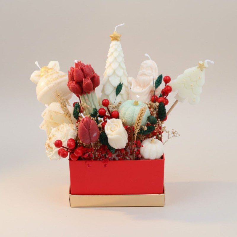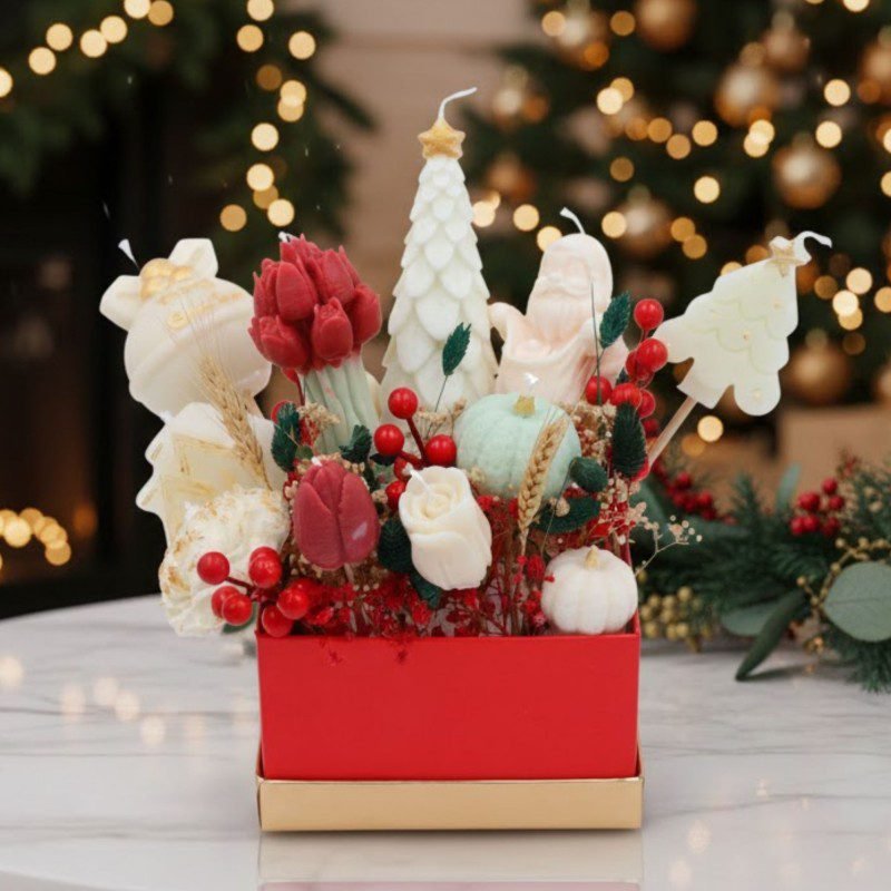 باقة كريسماس أنيقة بحجم وسط، مصمّمة بعناية لتمنح المكان لمسة دافئة واحتفالية. تضم شموعًا معطّرة بأشكال كريسماس جذابة، منسّقة مع ورد مجفف فاخر داخل بوكس ذهبي أنيق، لتكون خيارًا مثاليًا للديكور أو للإهداء.