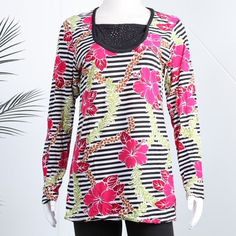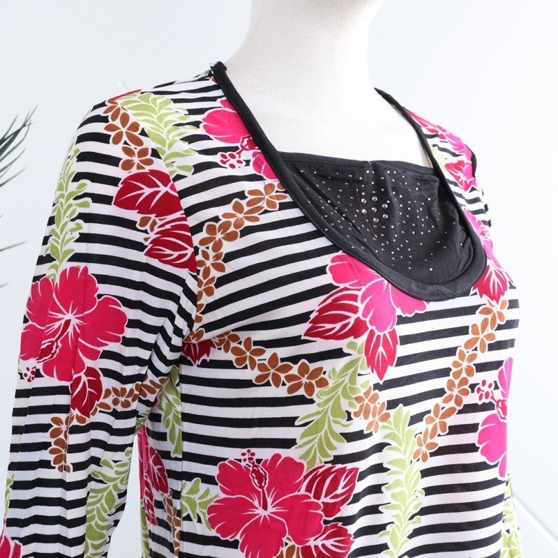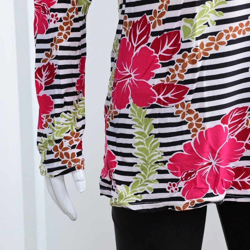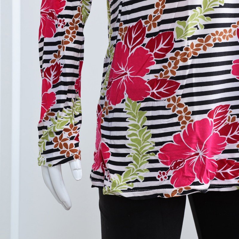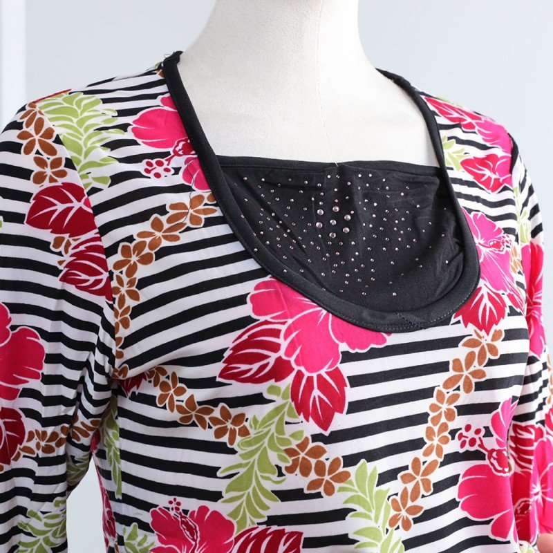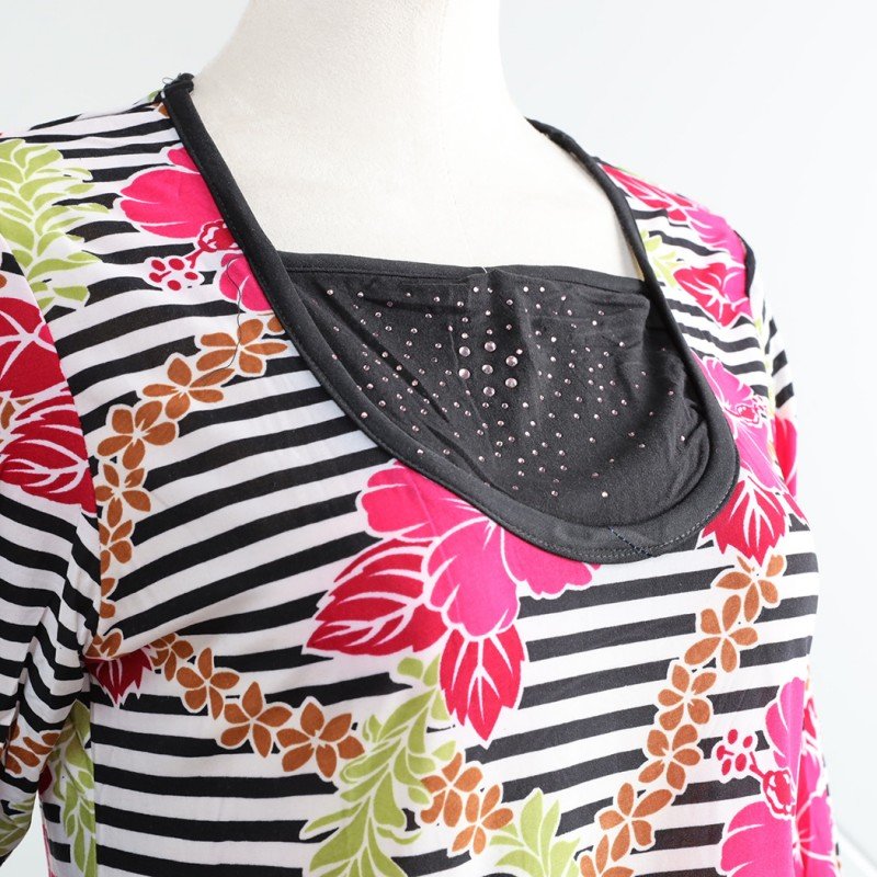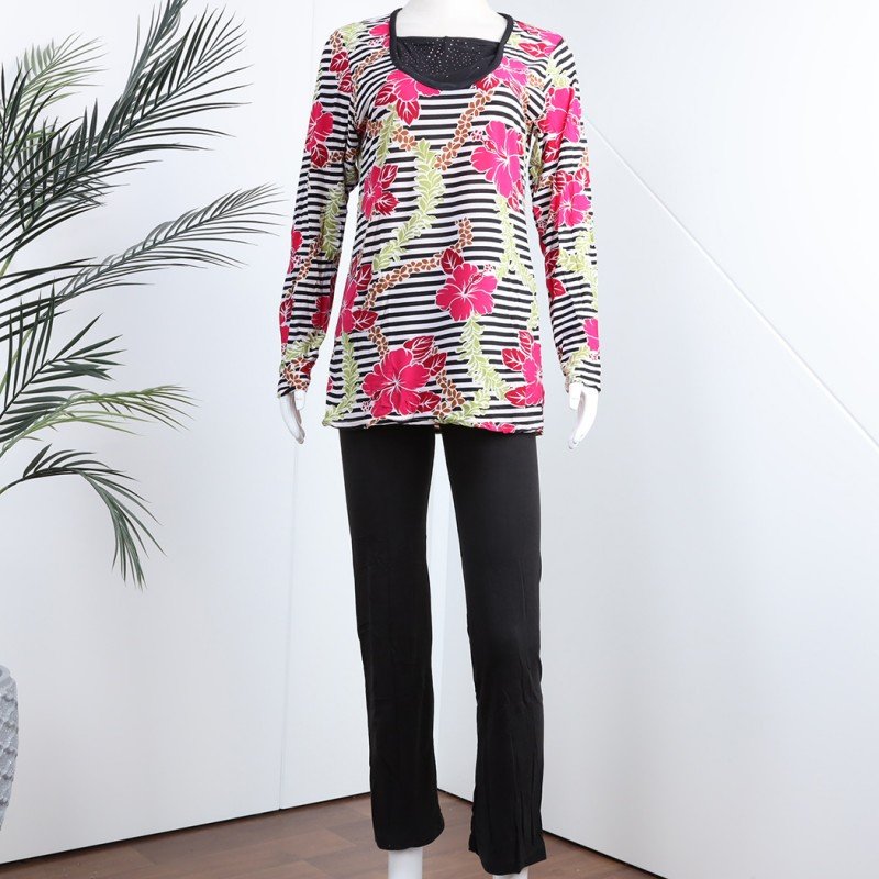 الختام: بيجامة بأكمام طويلة بتصميم نقشة مغربية ورد مخطط عرضي باللون الزهري والأسود هي الخيار المثالي للحصول على راحة تامة وأناقة أثناء أوقات الراحة. مع تصميمها العصري والمريح، ستكون هذه البيجامة إضافة رائعة إلى خزانة ملابسك اليومية.