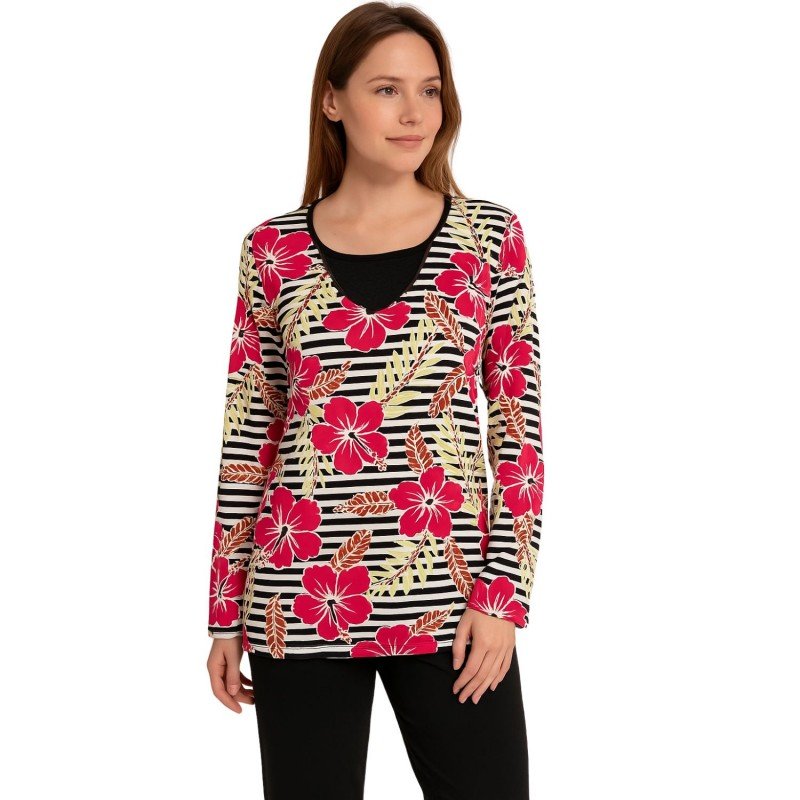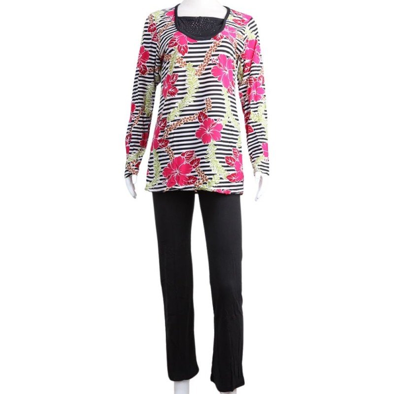 بيجامة بأكمام طويلة بتصميم نقشة مغربية ورد مخطط عرضي للنساء – لون زهري وأسود
