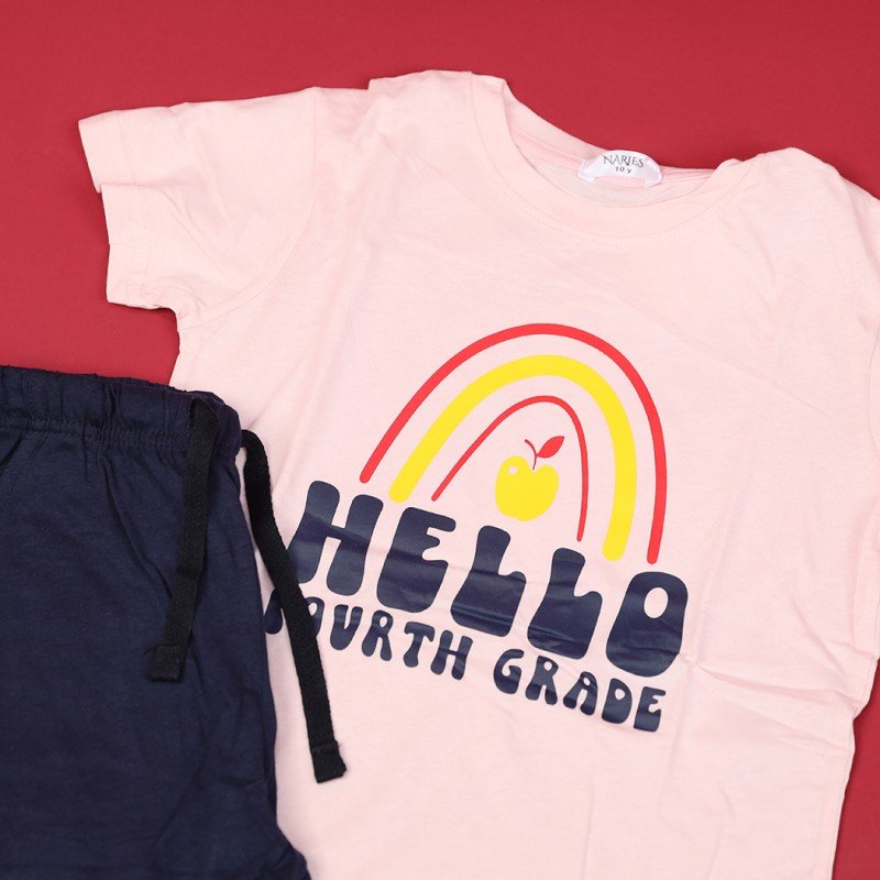 بجامة صيفية للأطفال لون زهري فاتح وكحلي بتصميم تفاحة صغيرة