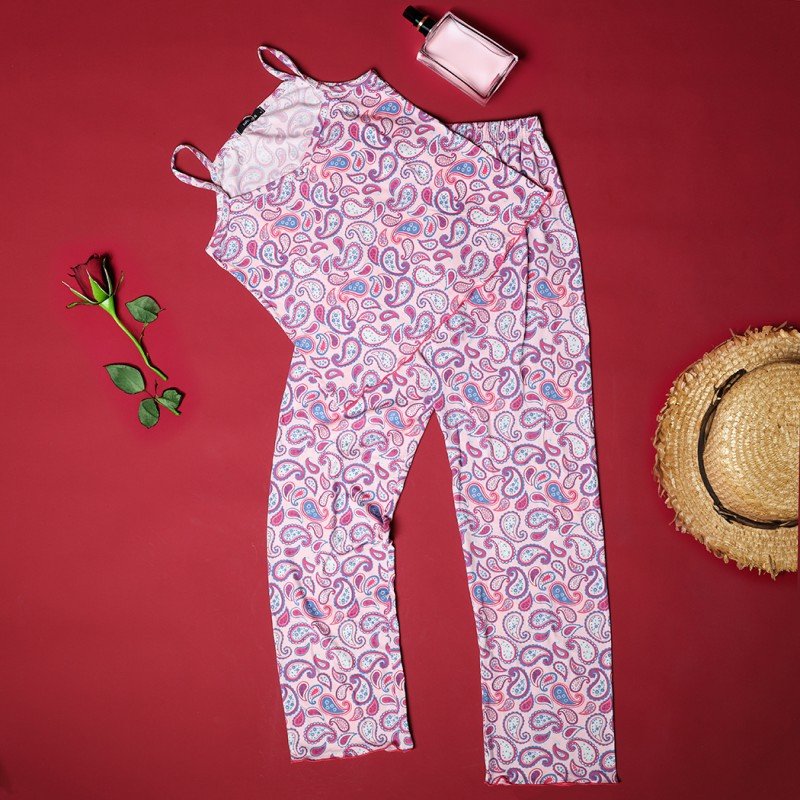 بجامة صيفية للنساء لون زهري بتصميم زخارف
