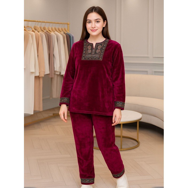 ✅ بجامة فرو نسائية مُكونة من قطعتين (بلوزة بأكمام طويلة، مع بنطلون).
