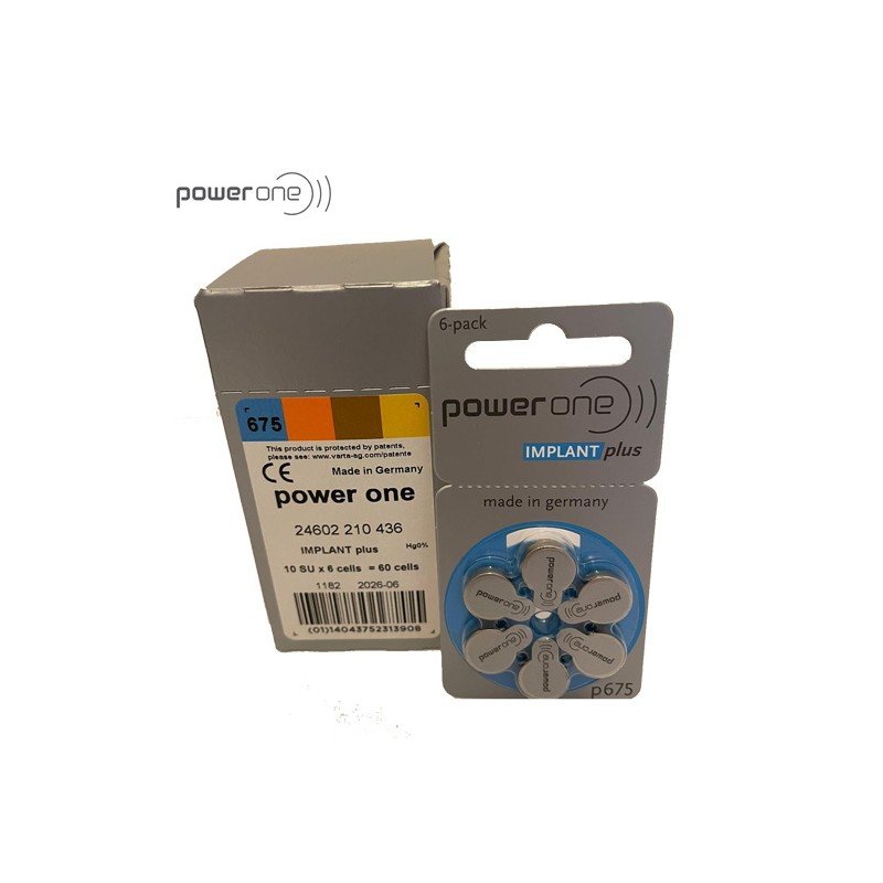 بطاريات القوقعة باور وان – رقم 675 طاقة مساعدة للسمع مع آداء متميز وطويل الأمد خالية من مادة الزئبق. العلبة تحتوي على عشر كرتات / 60 بطارية صناعة ألمانية
