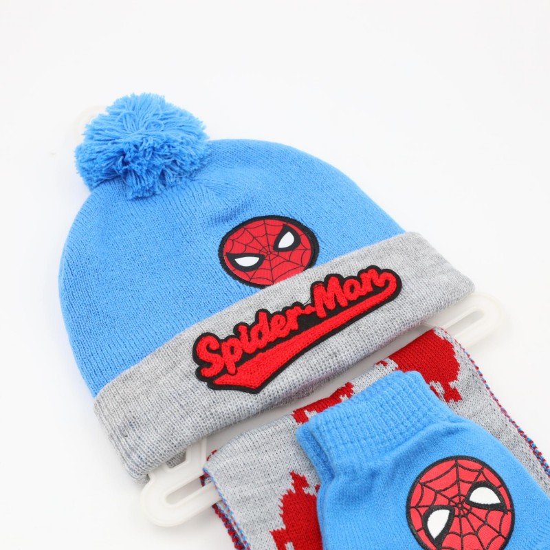 بكج شتوي متكامل للأطفال بتصميم شخصية سبايدر مان من ديزني، يتكوّن من طاقية مع بوم بوم علوي، كفوف، ولفحة متناسقة باللونين الأزرق والرمادي. مصمم لتوفير الدفء والراحة خلال فصل الشتاء مع خامة محبوكة ناعمة ومناسبة للاستخدام اليومي.