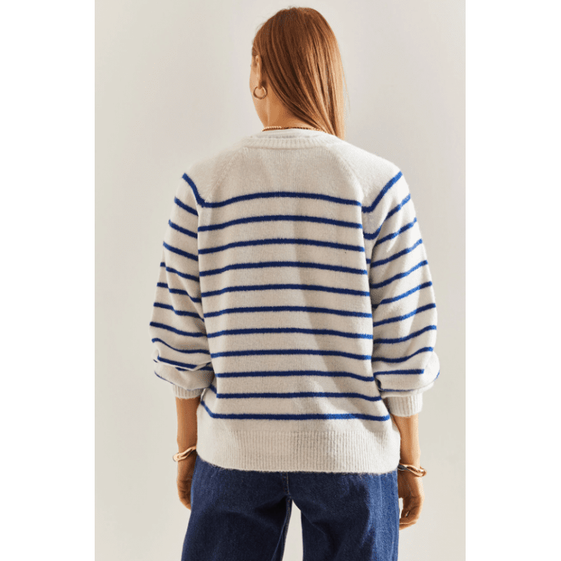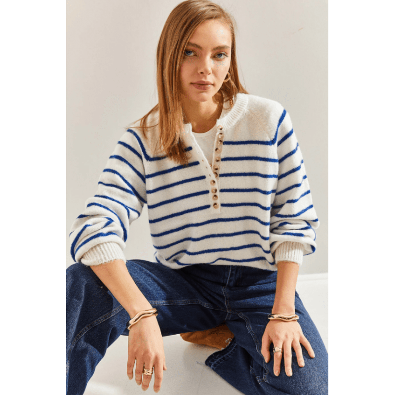 بلوزة ستاتي شتوي أبيض مخطط أزرق