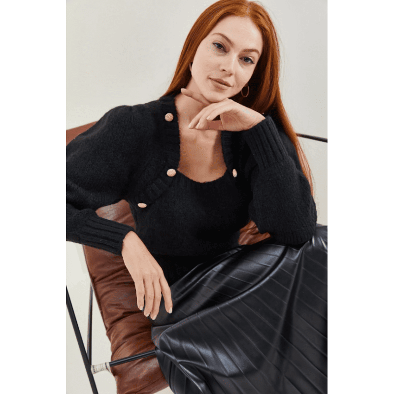 بلوزة ستاتي شتوي لون أسود مع أزرار على الأكتاف