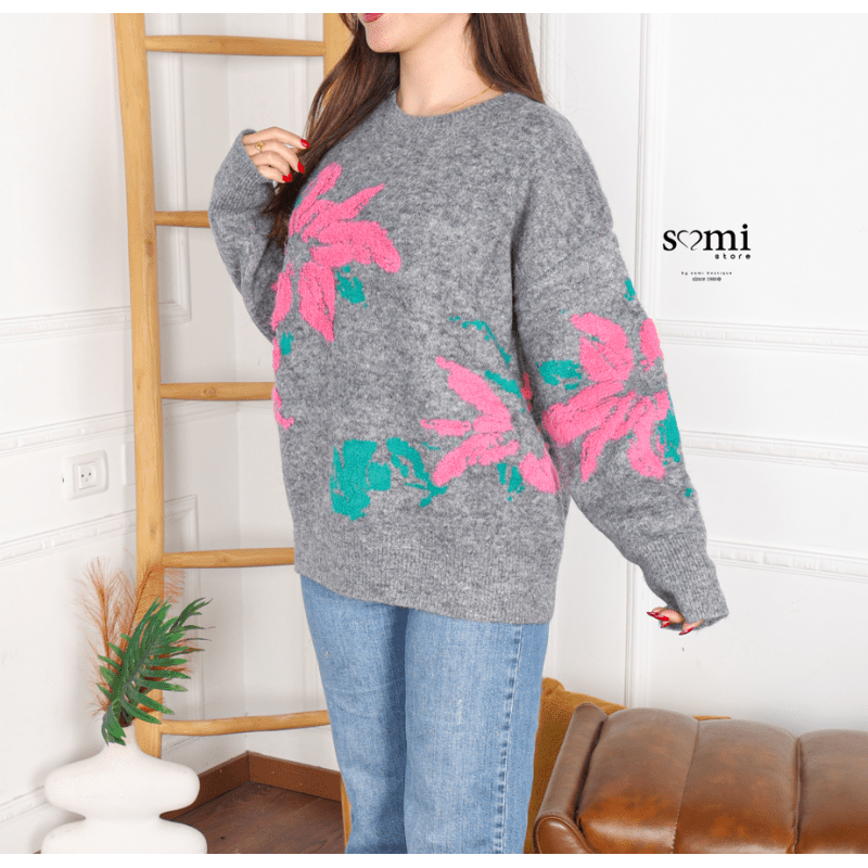 بلوزة صوف شتوية أنيقة بلون سكني ناعم، مزينة برسومات زهرية ملونة تضيف لمسة أنثوية وعصرية. تصميمها مريح بقصة واسعة قليلًا، مثالية للإطلالات اليومية في الأجواء الباردة مع إحساس دافئ وناعم على البشرة.