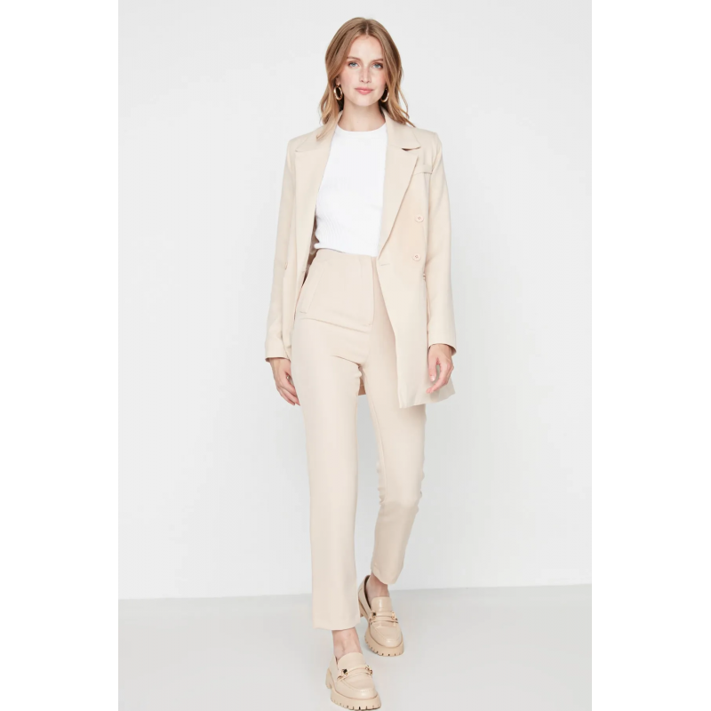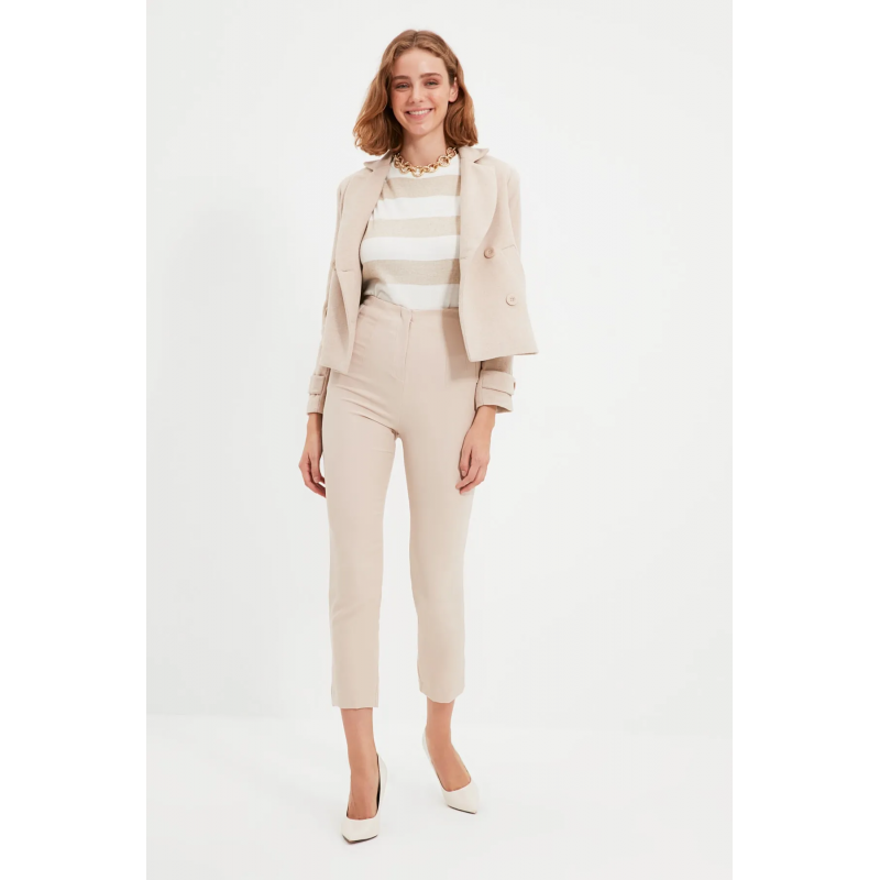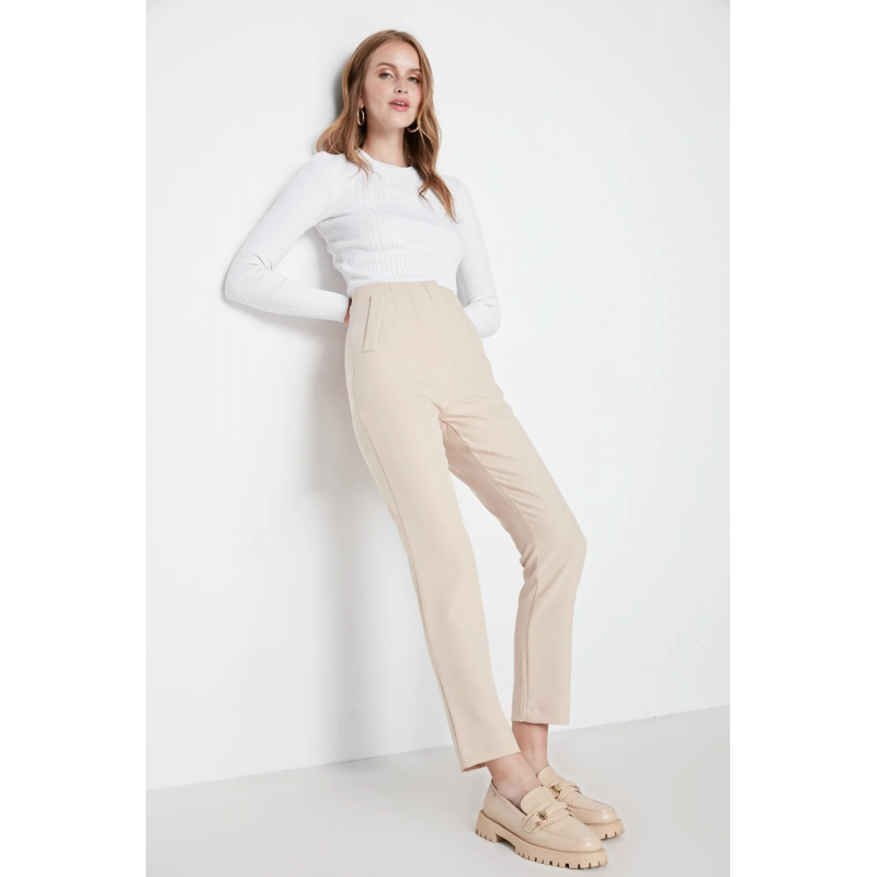 بنطال تريندول منسوج بخصر عالٍ وطول الكاحل للنساء لون بيج