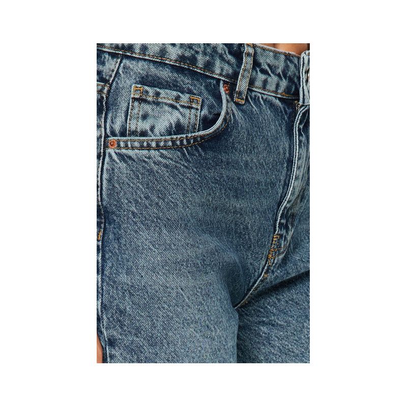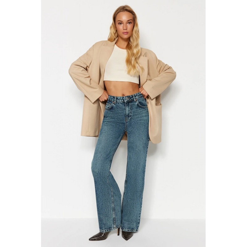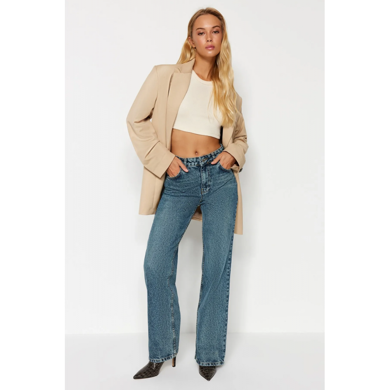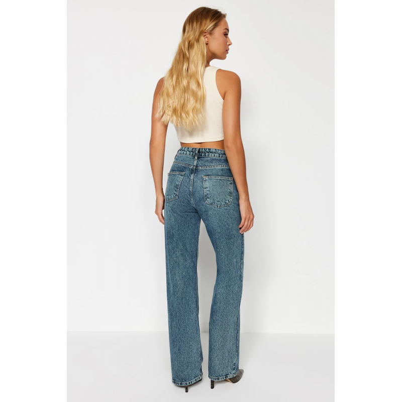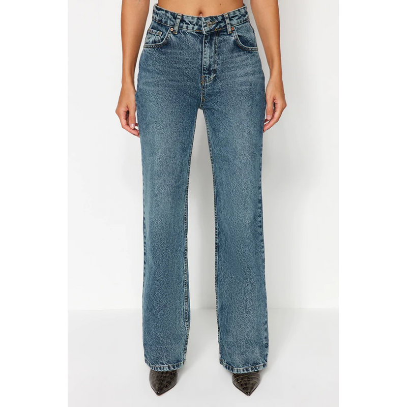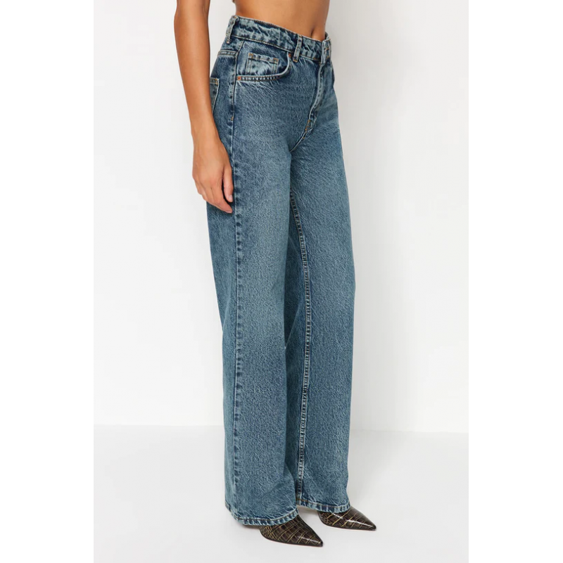 بنطلون جينز ساق عريض بخصر عالي للنساء لون أزرق