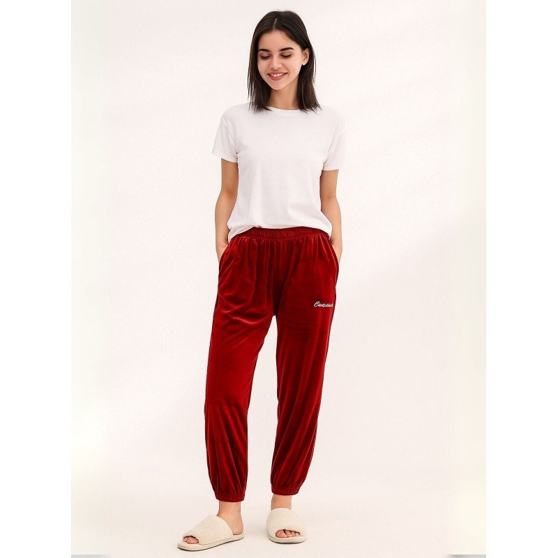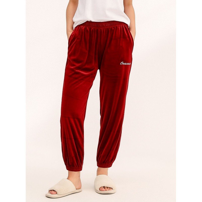 ✅ بنطلون مخمل بتصميم عريض مع أرجل مطاطية للنساء لون خمري ✨