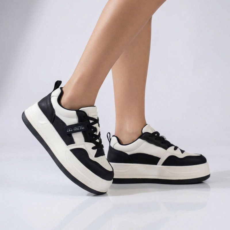 بوت رياضي جلد نعل عريض للنساء لون ابيض وكحلي