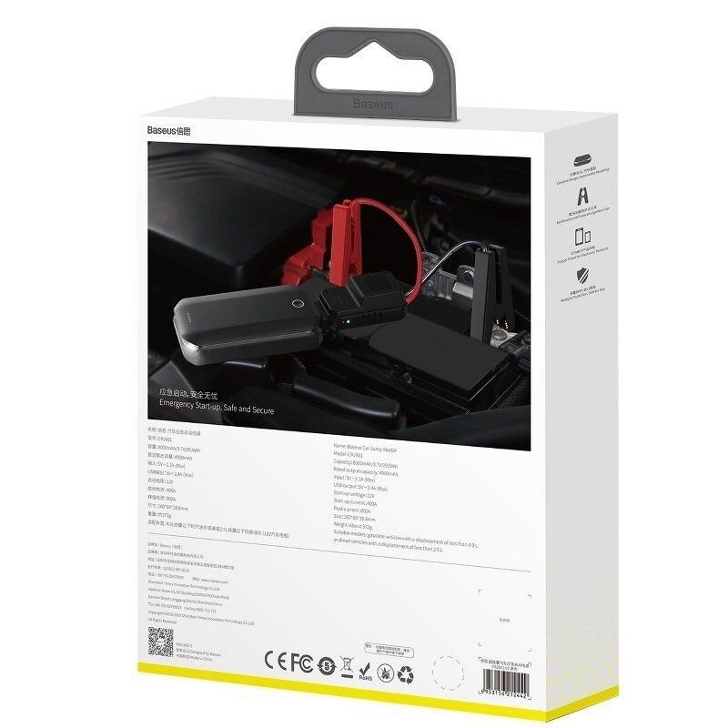 Rated output capacity: 4900mAhInput: 5V / 2.1A (Max)USB output: 5V2.4A (Max)Start-up voltage: 12VStart-up current: 400APeak current: 800A