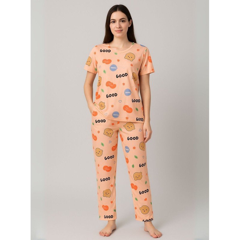 بيجامة ستاتية لون برتقالي اشكال ملون بنطلون وبلوزة نص كم One Size