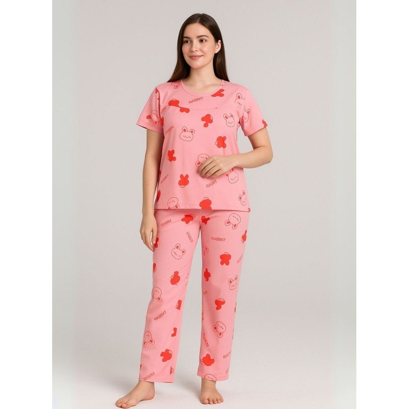 بيجامة ستاتية لون زهري اشكال ملون بنطلون وبلوزة نص كم One Size