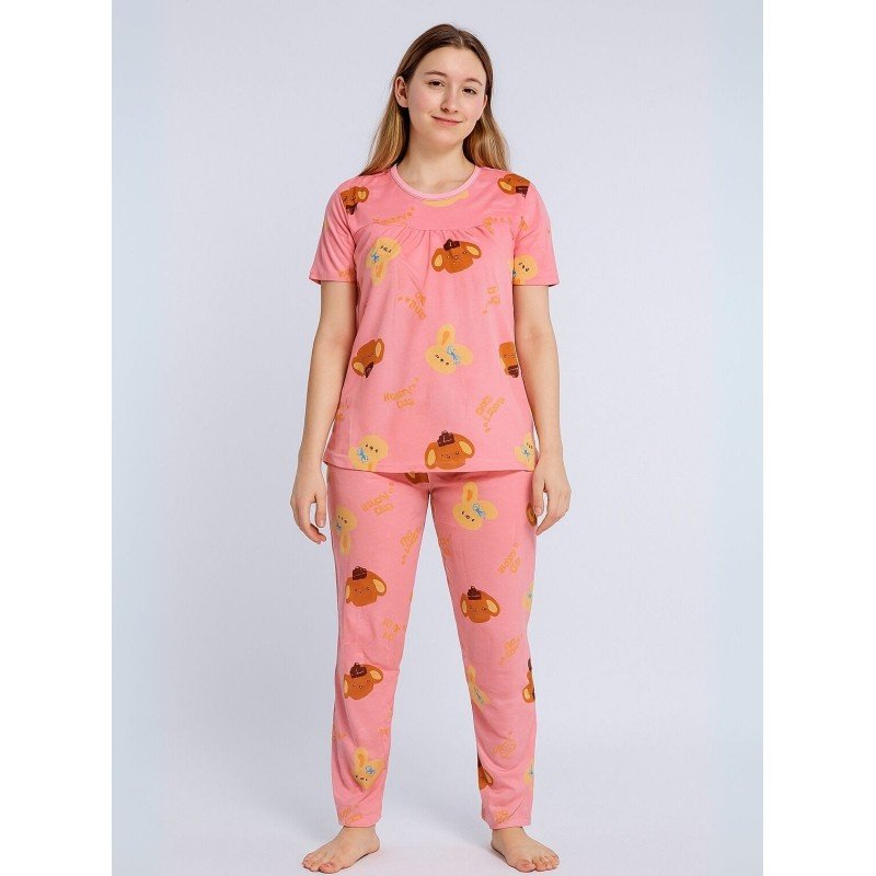 بيجامة ستاتية لون زهري اشكال ملون بنطلون وبلوزة نص كم One Size