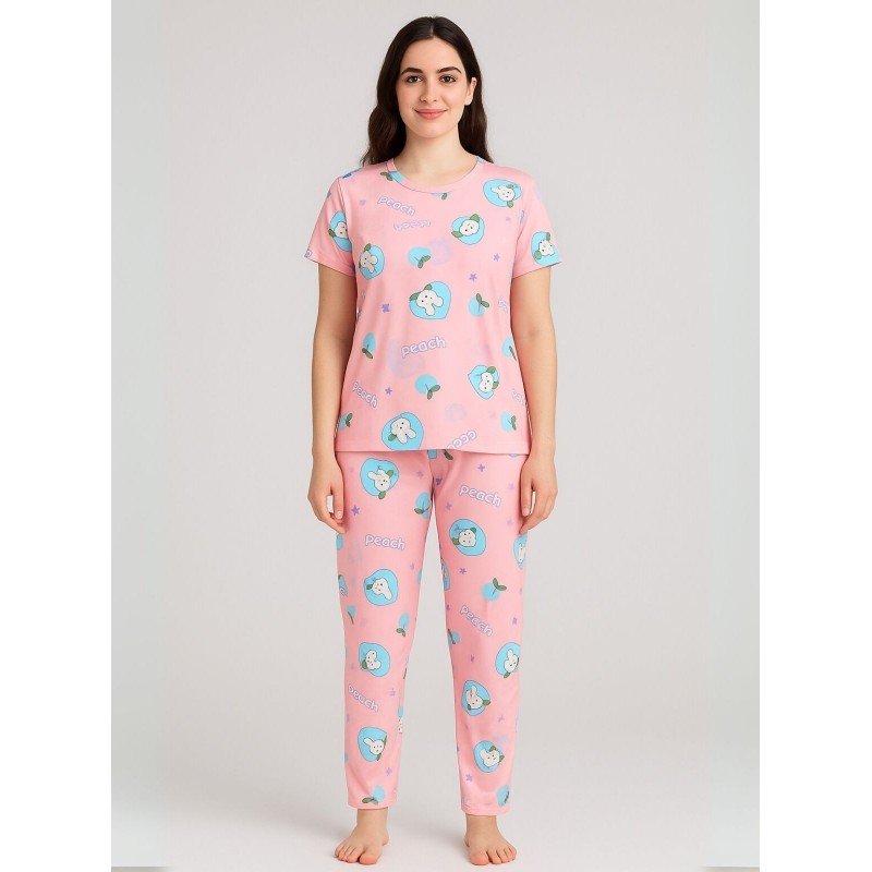 بيجامة ستاتية لون زهري اشكال ملون بنطلون وبلوزة نص كم One Size