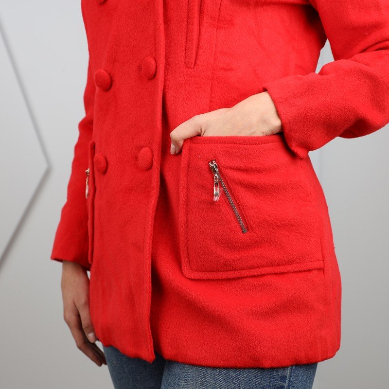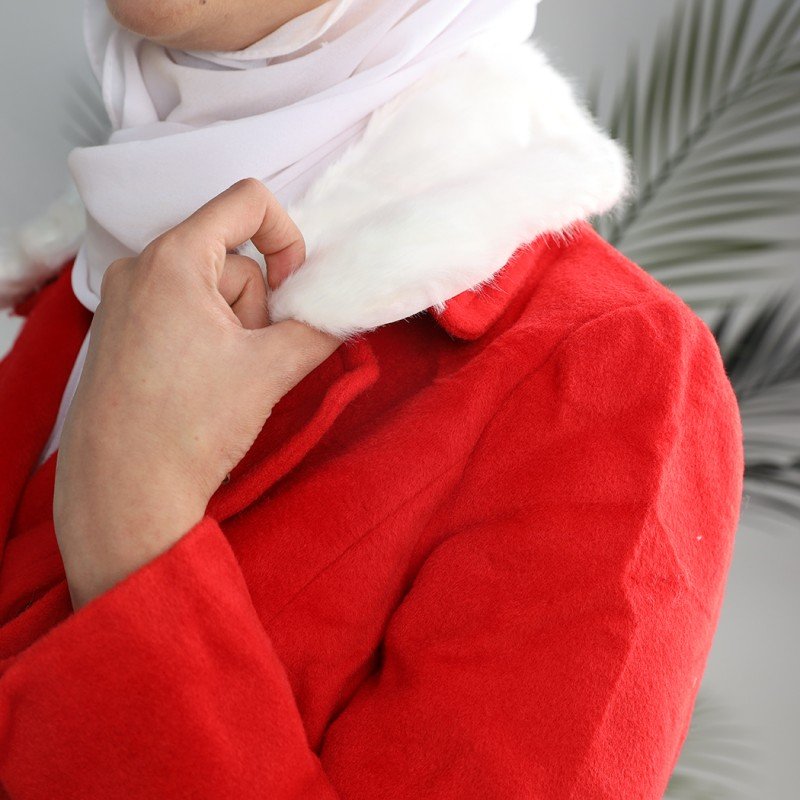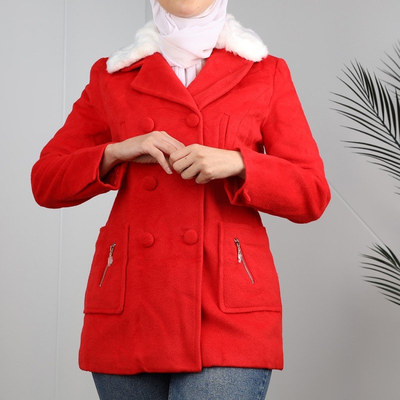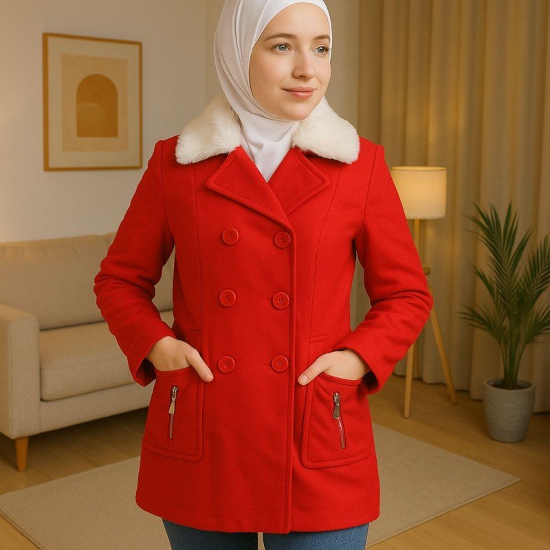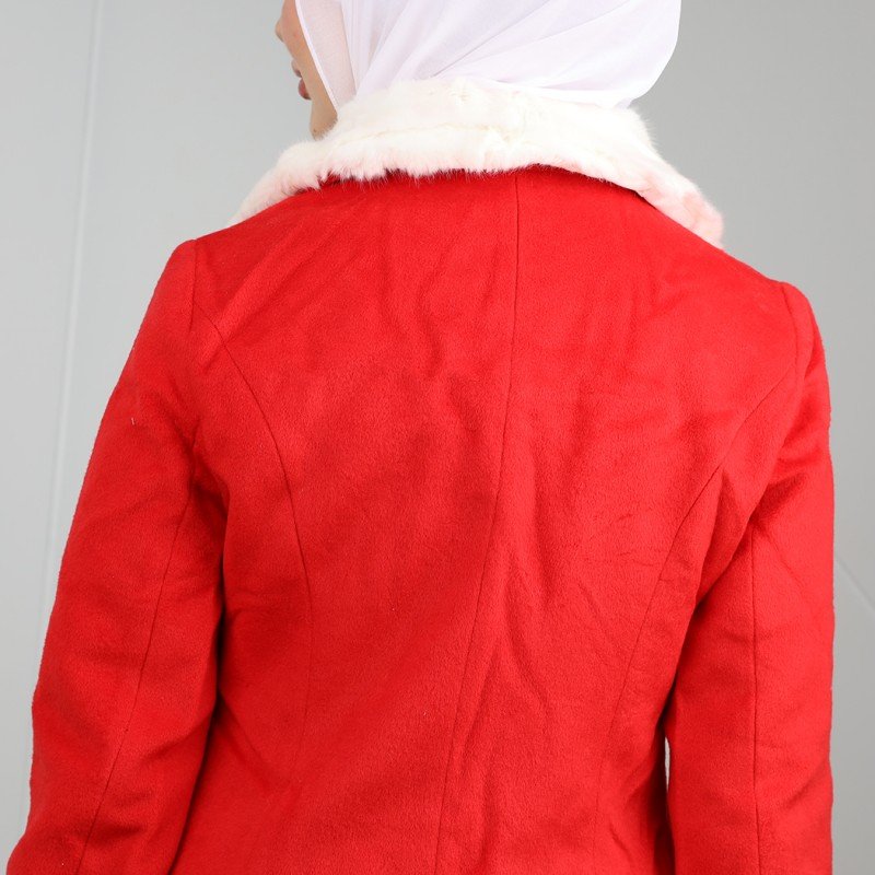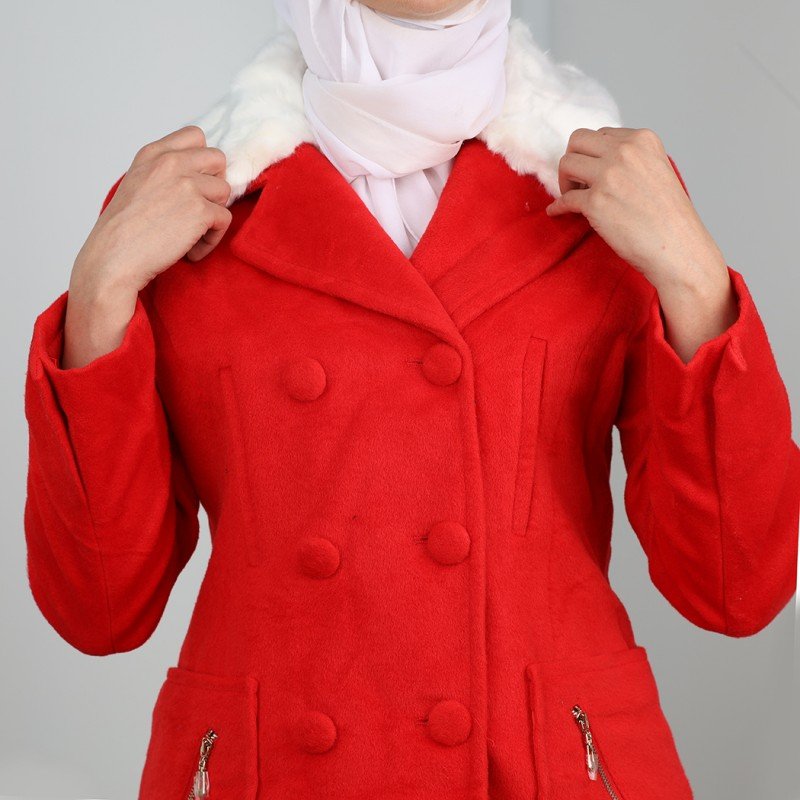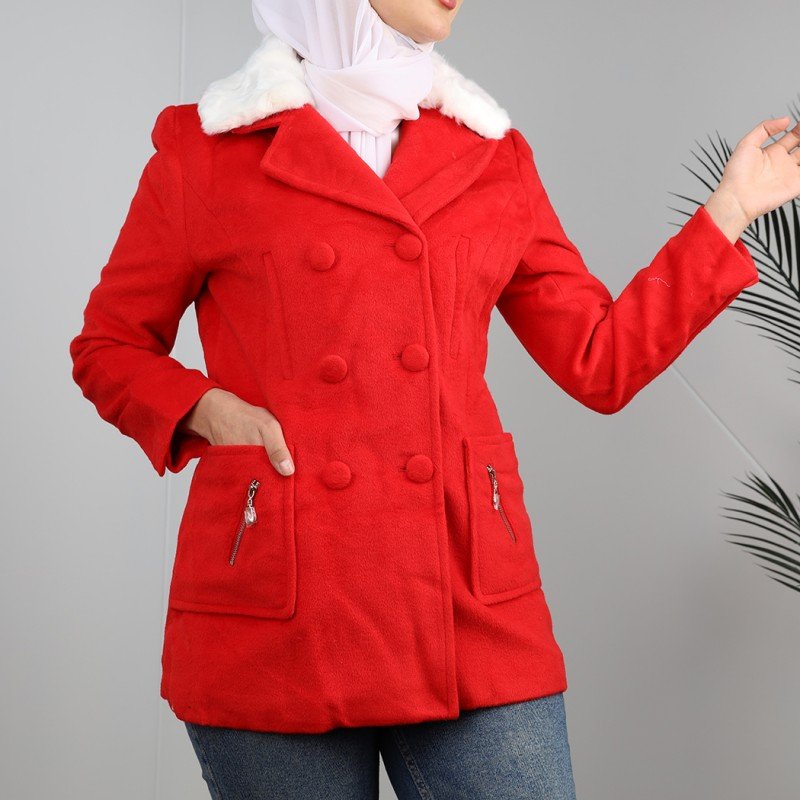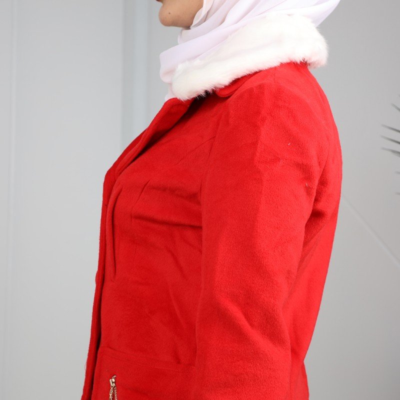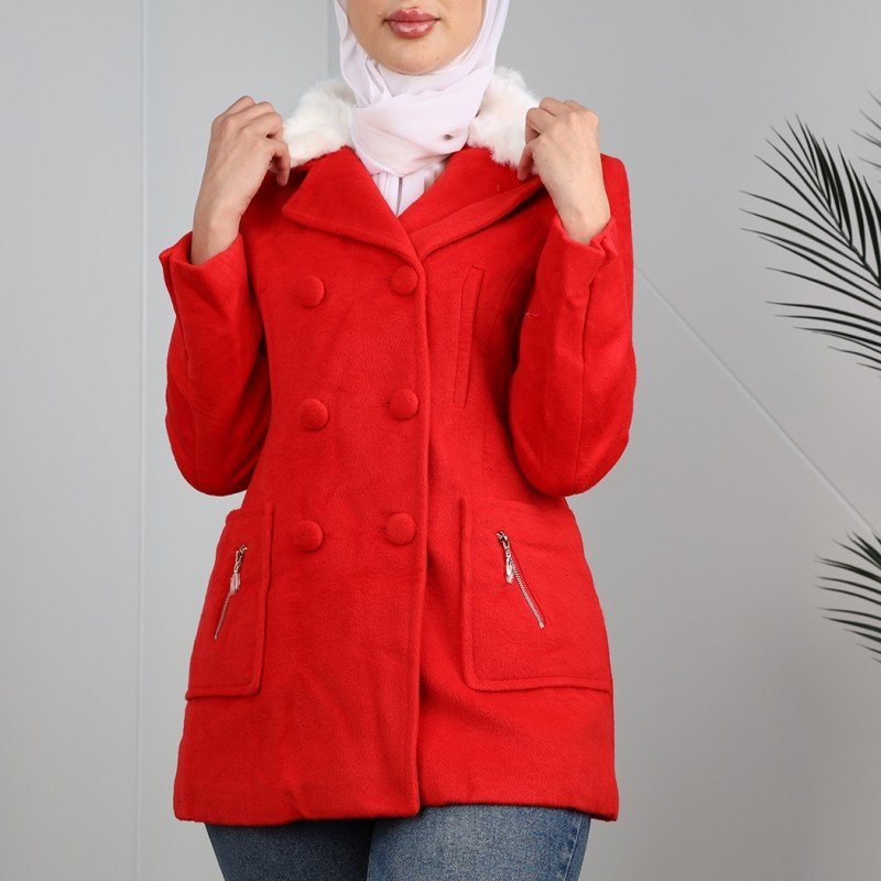 جاكيت شتوي جوخ للنساء مع قبة بيضاء لون أحمر