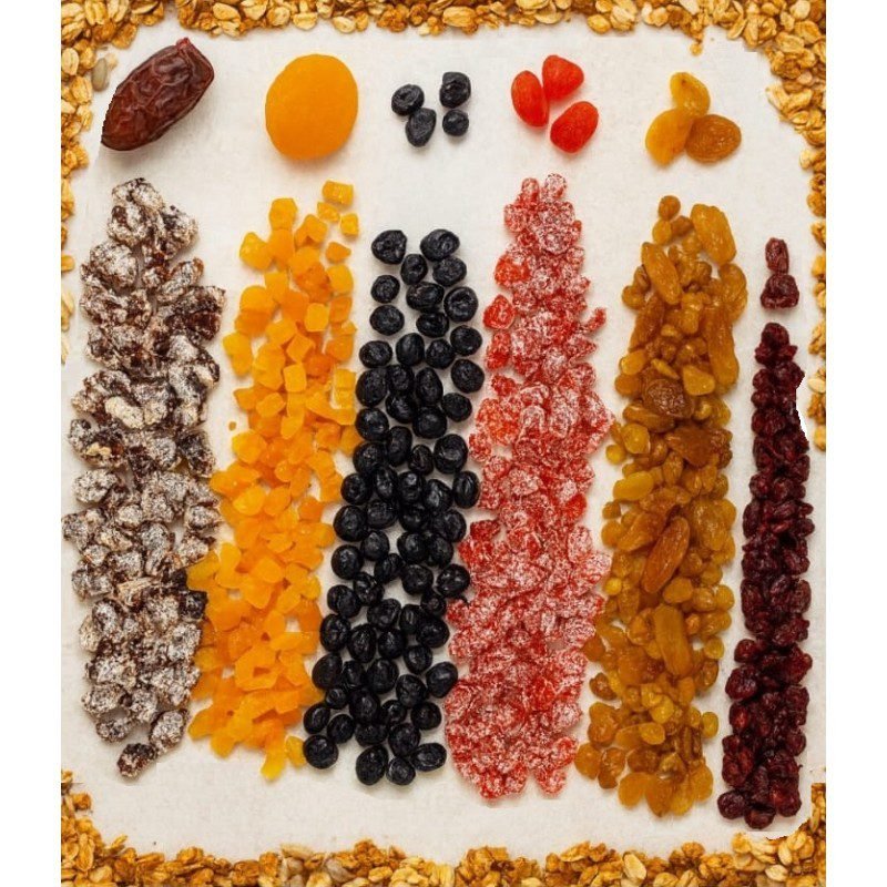 شوفان كامل · عسل طبيعي · جوز · لوز · كاجو · فستق · بذور عباد الشمس · بذور الشيا · بذور القرع · بذور الكتان · كرز · زبيب · توت بري · زيت جوز الهند العضوي · مشمش · تمر · فراولة · سمسم.