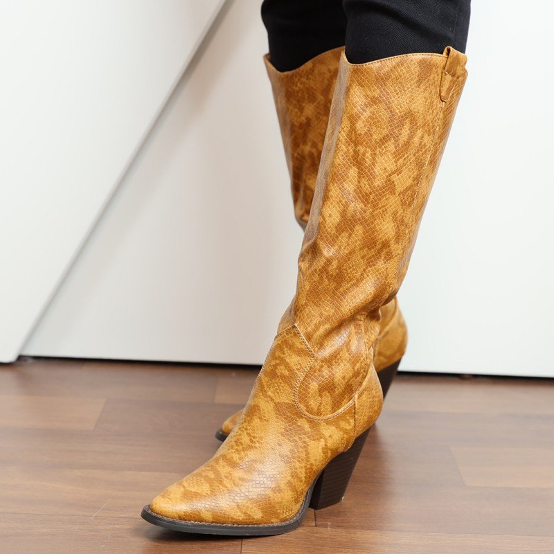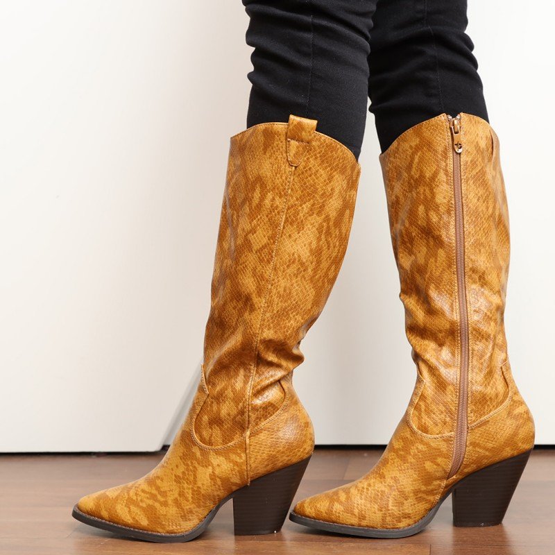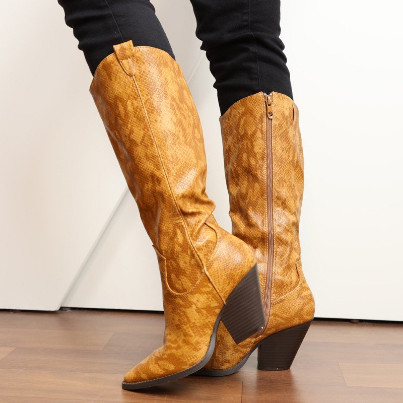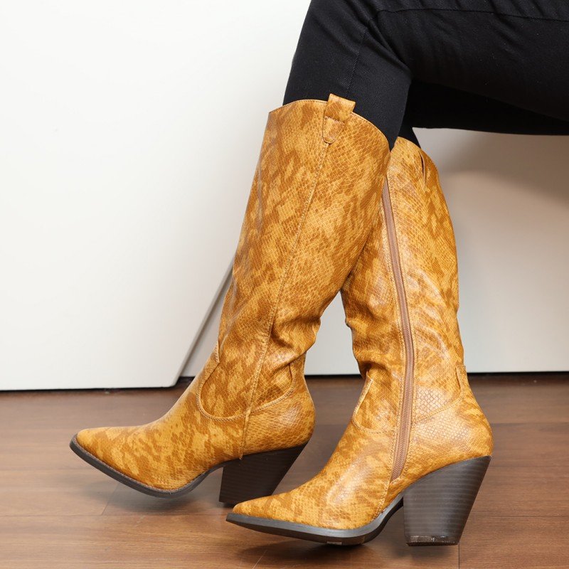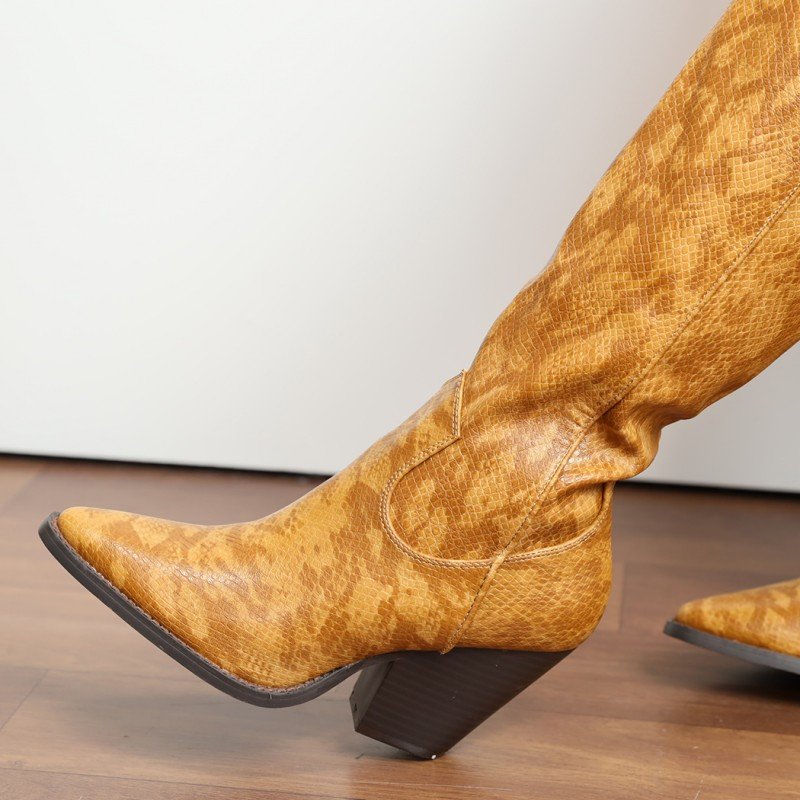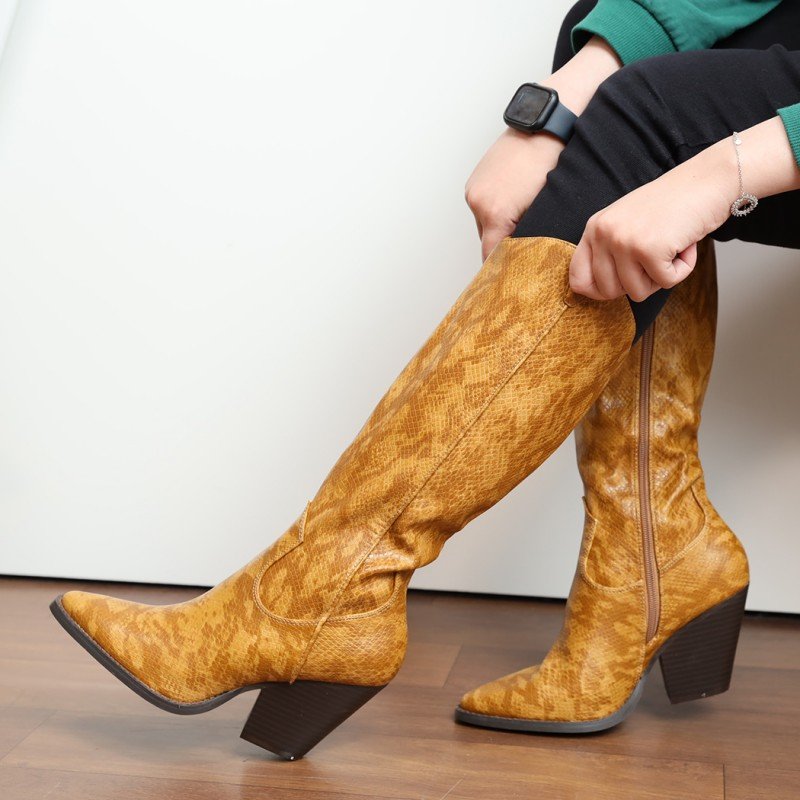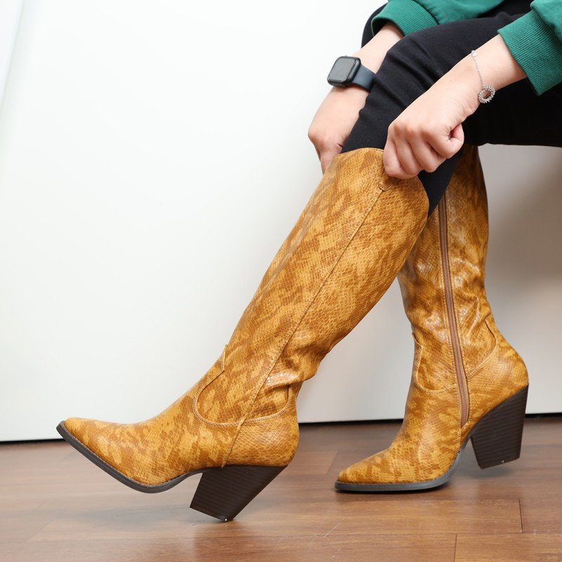 ✅ جزمة كعب وتصميم جلد أفعى ساق طويل للنساء