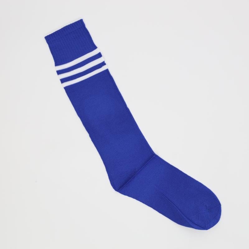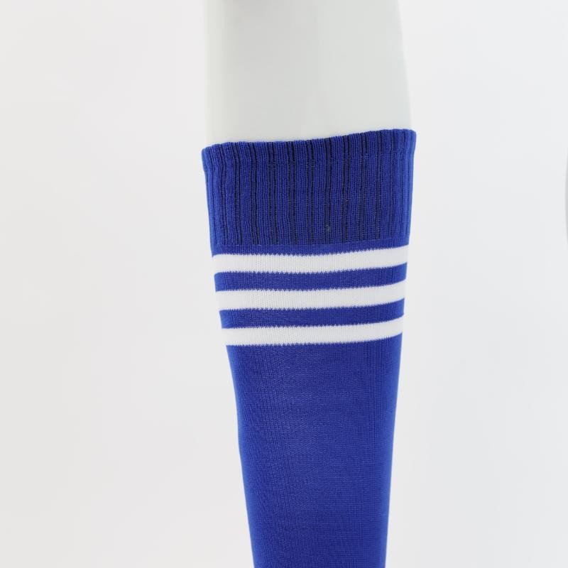 جوارب كرة قدم رياضية طويلة للشباب لون أزرق مخطط أبيض من أعلى