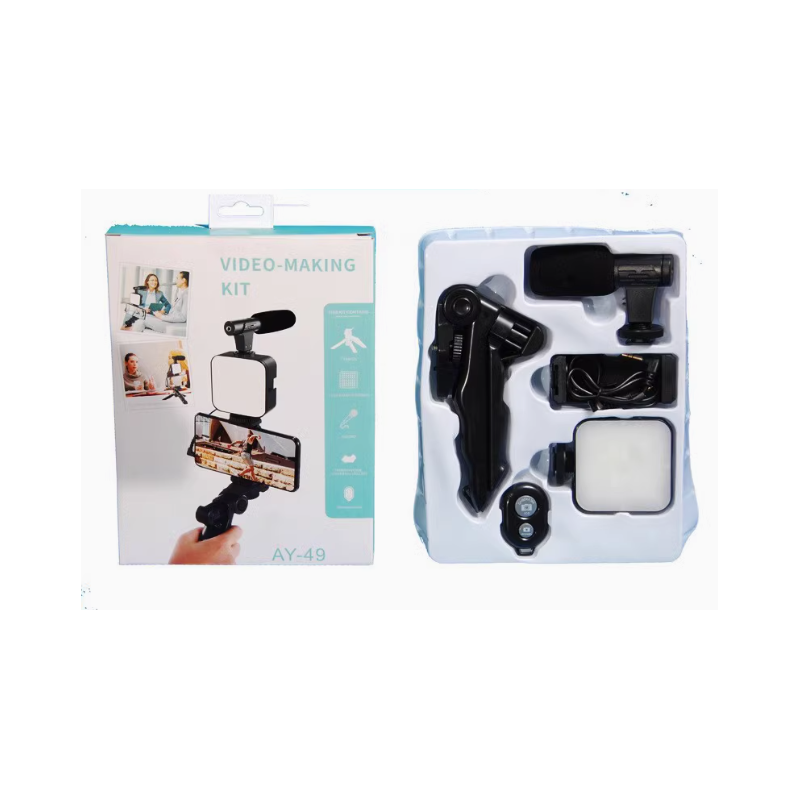حامل هاتف ثلاثي القوائم وميكروفون صغير وضوء ليد لتصوير الفيديو للسوشال ميديا