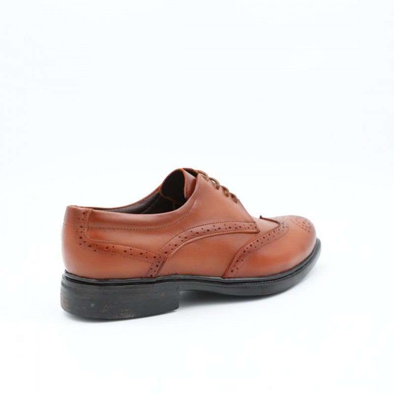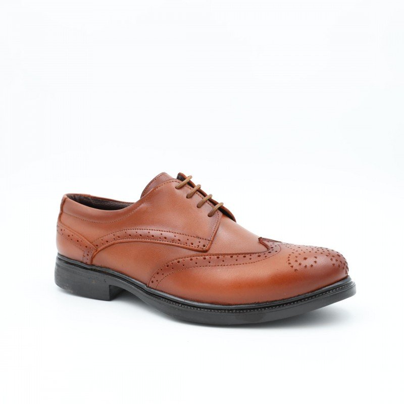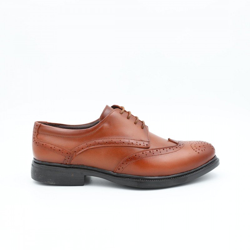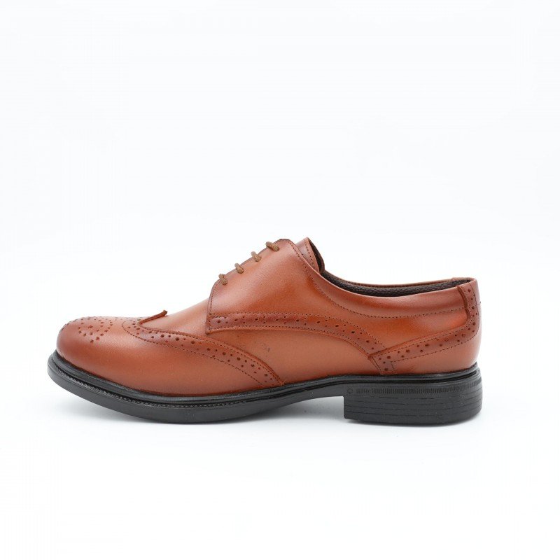 حذاء رسمي رجالي من I Can بلون عسلي فاخر، مصنوع من جلد طبيعي عالي الجودة، يتميّز بنقشة بروغ (Brogue) المزخرفة على الأطراف مع تصميم برباط كلاسيكي. نعل أسود مريح وعملي للاستخدام اليومي والمناسبات.