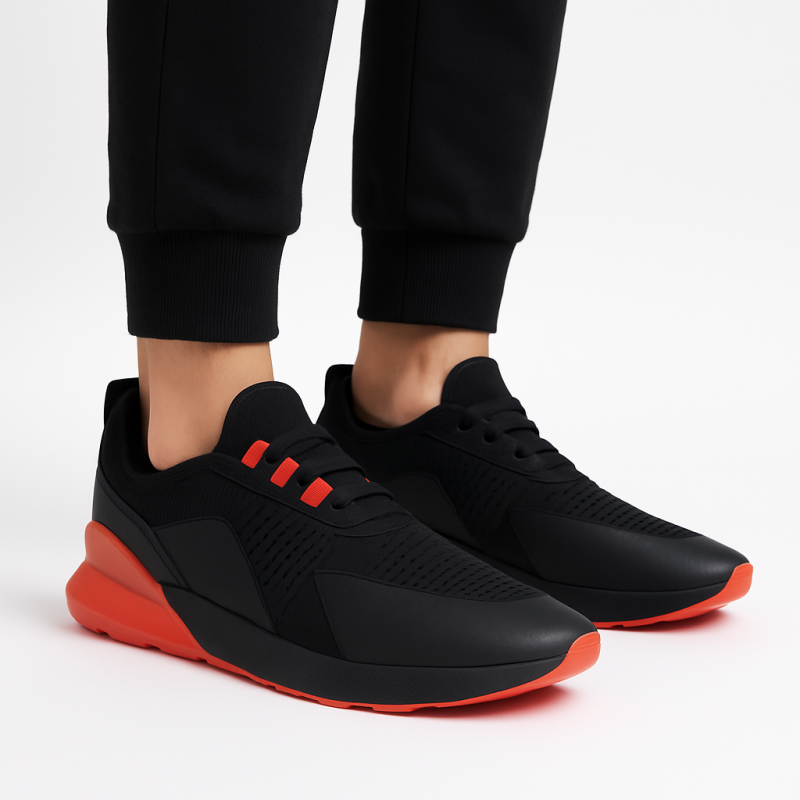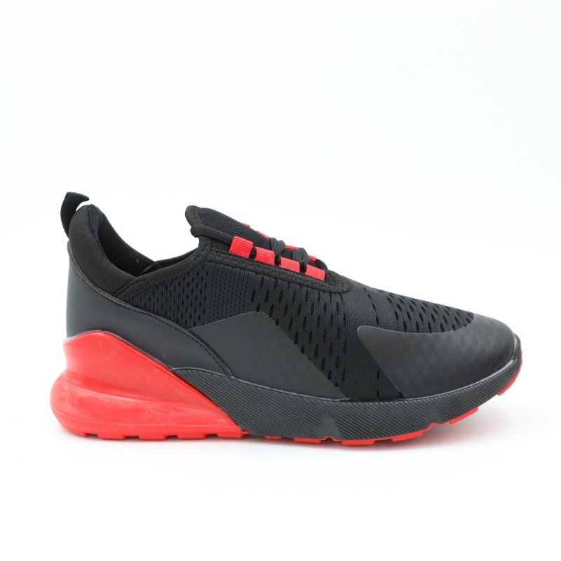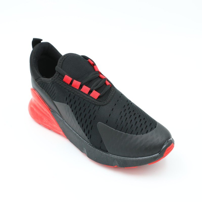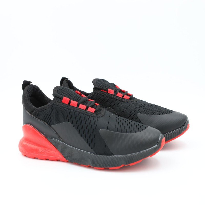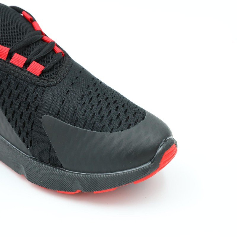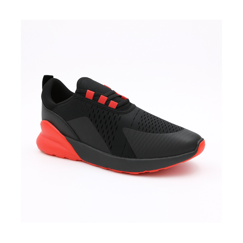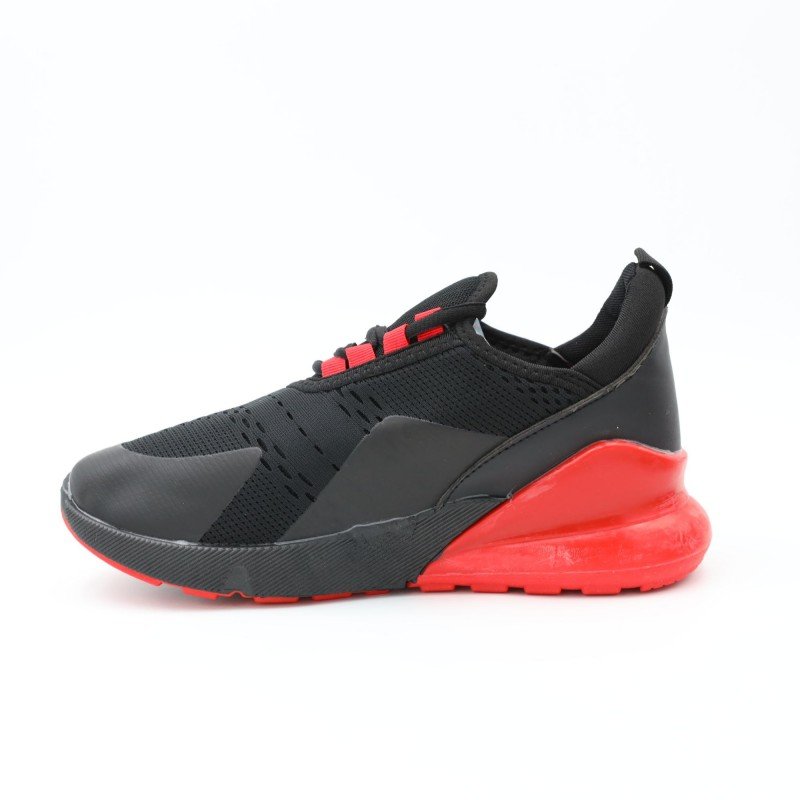 ✅ لون أسود أنيق مع لمسات حمراء جريئة ✅ خامة خفيفة ومهوّاة بتوفر راحة مثالية للقدم ✅ نعل سفلي باللون الأسود، صلب ومقاوم للانزلاق ✅ رباط مطاطي سهل اللبس بدون عقد ✅ تصميم عصري مناسب للمدرسة، الرياضة، أو الطلعات
