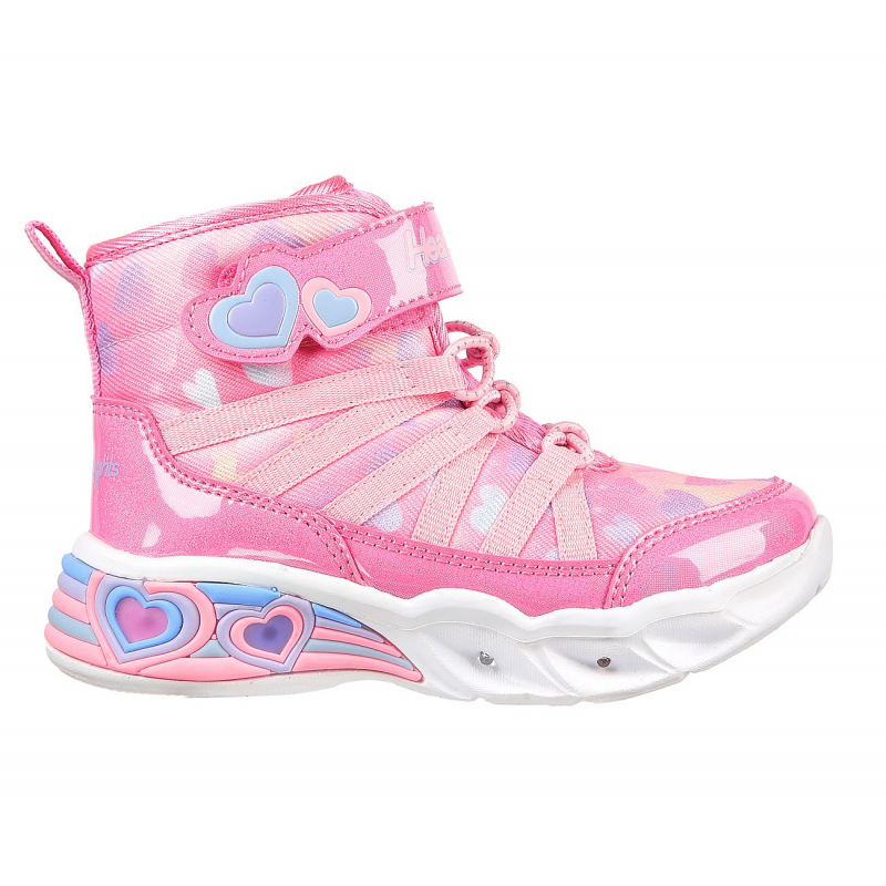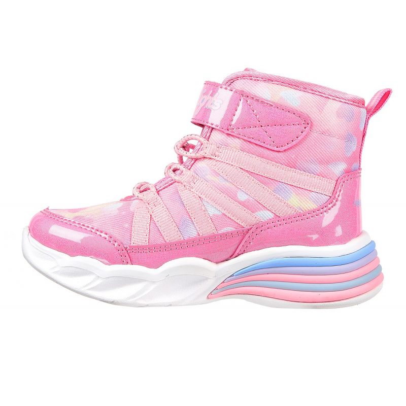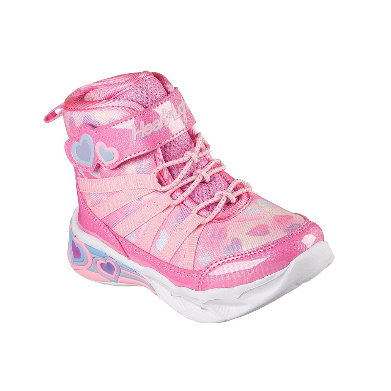 Light-up your steps with heart filled style in Skechers Sweetheart Lights – Dreamy Love. This sporty sneaker boot features a canvas and synthetic upper with an allover heart print and shock-absorbing light-up midsole.