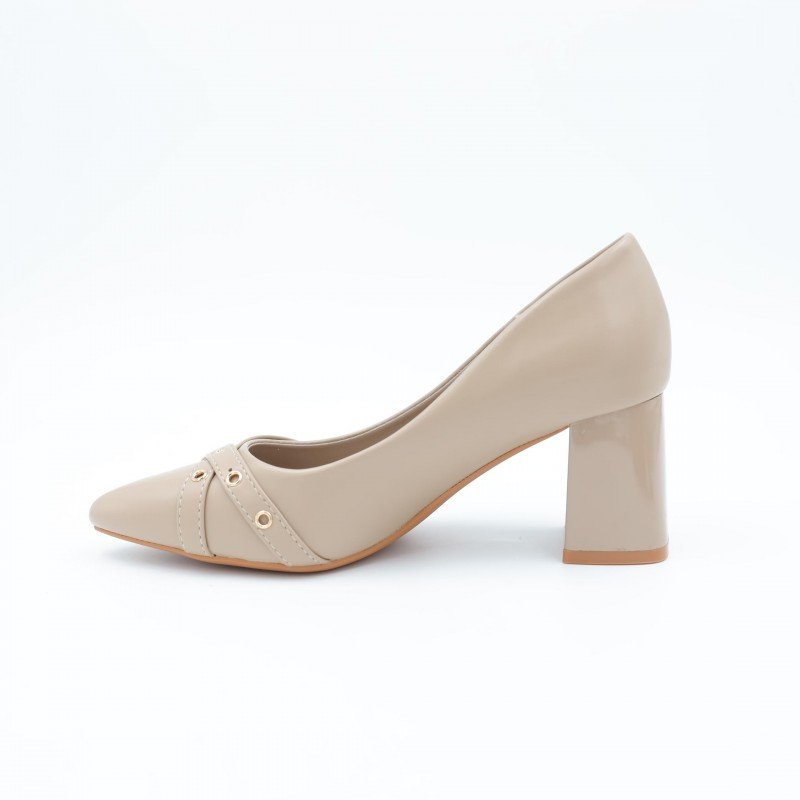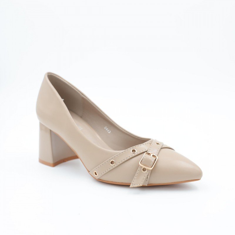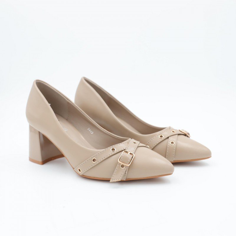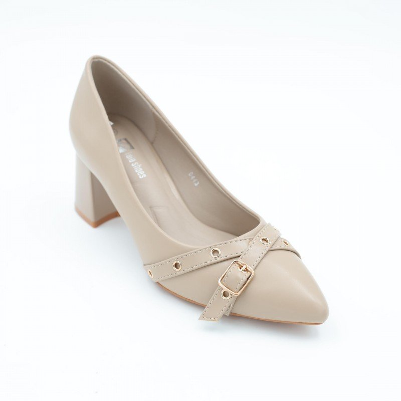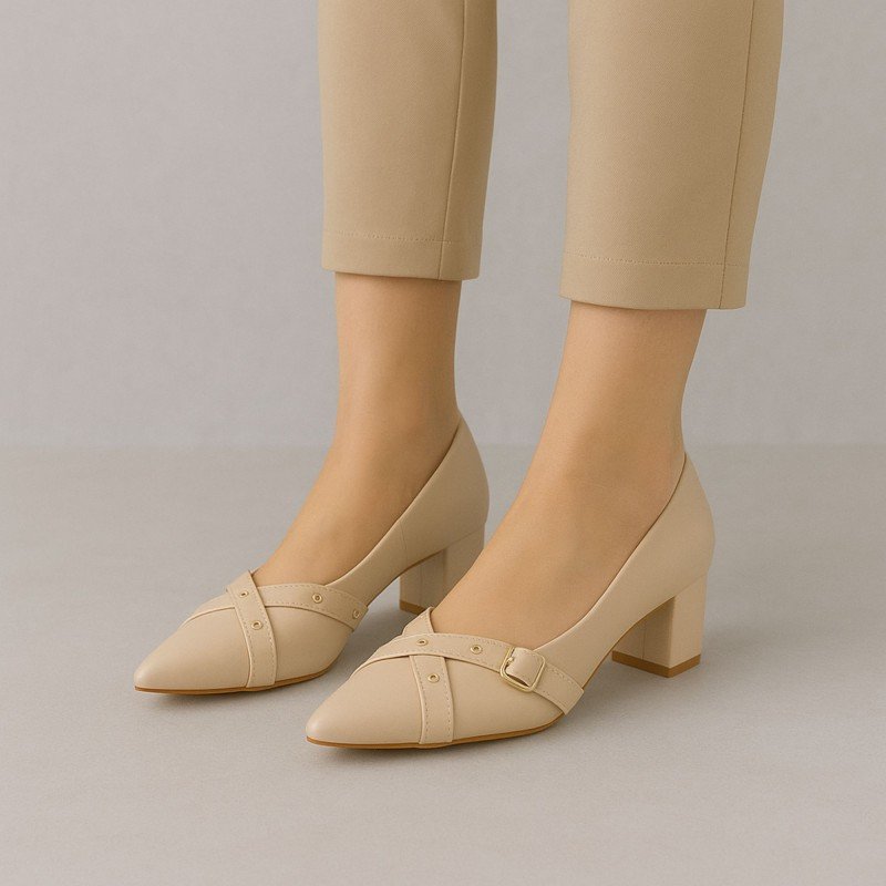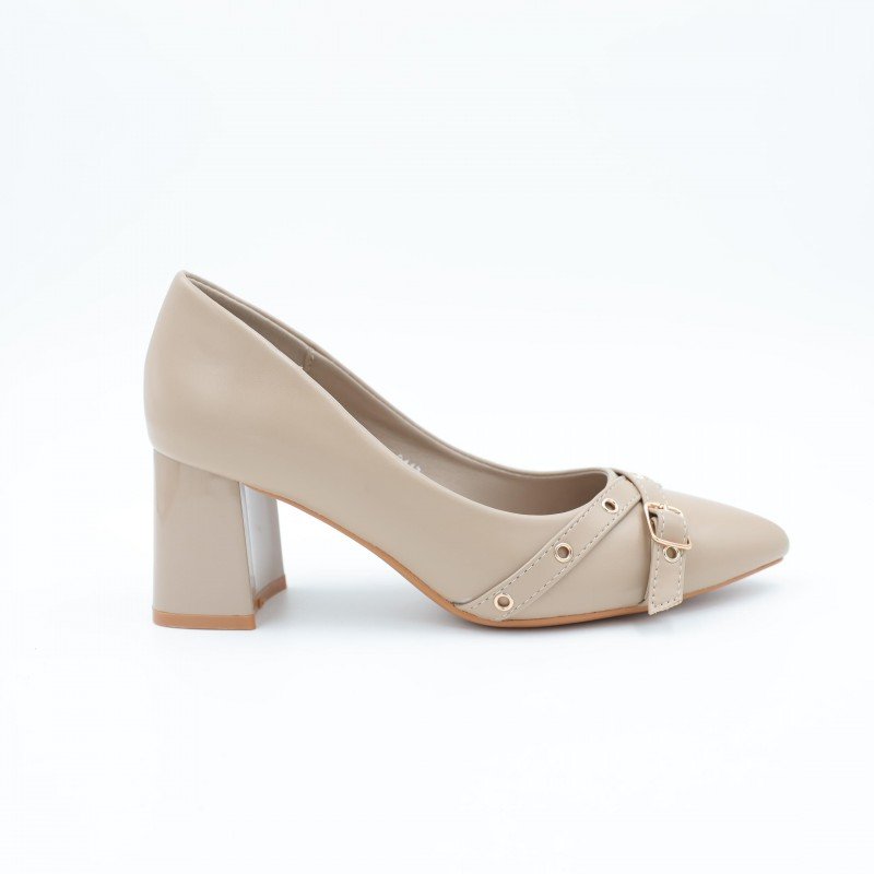حذاء كعب متوسط نسائي بتصميم كلاسيكي مع احزمه مزخرفه لون بيج