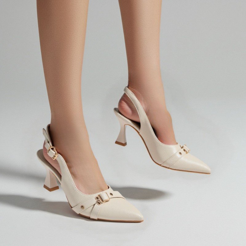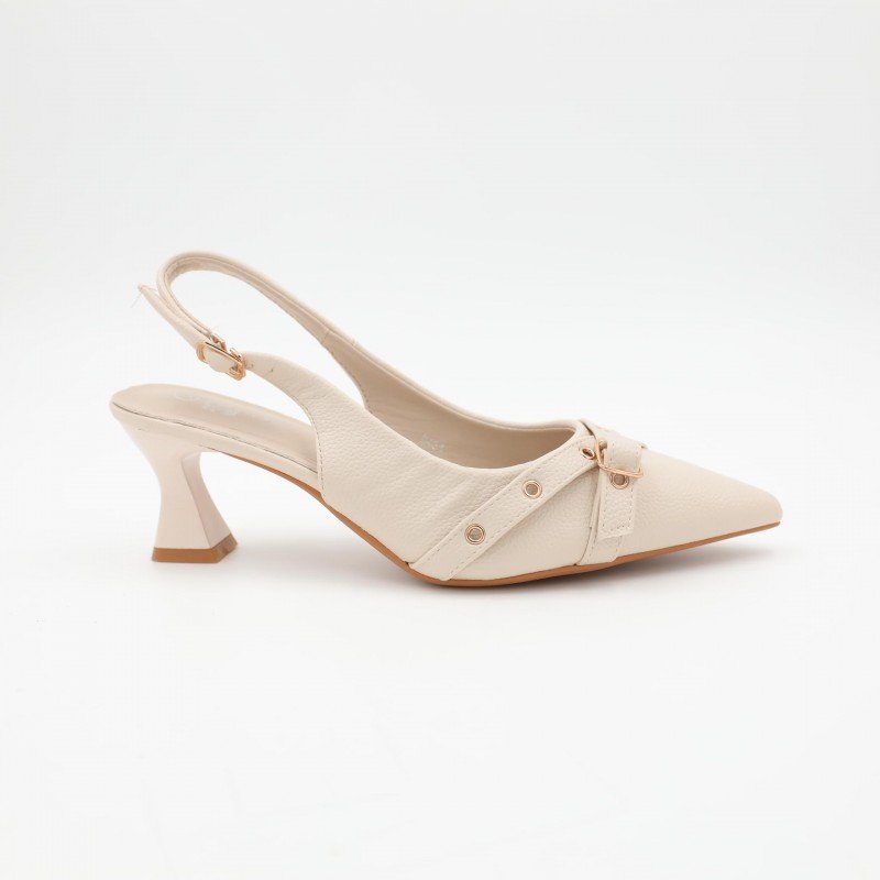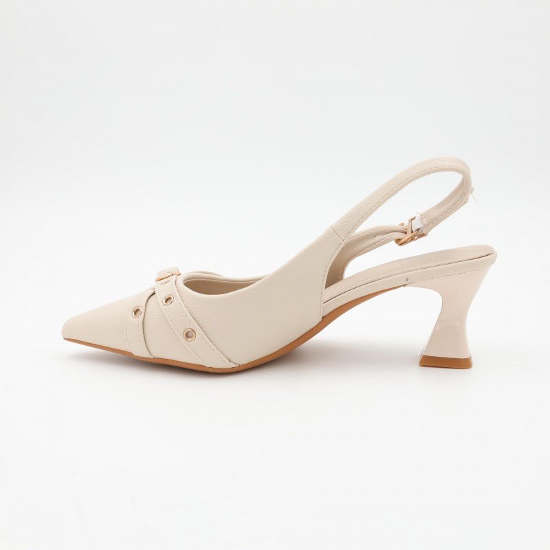 حذاء كعب متوسط نسائي بكعب رفيع وحزام مزخرف بتصميم مفتوح من الخلف لون بيج
