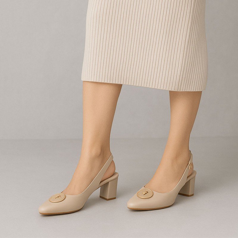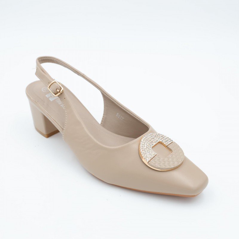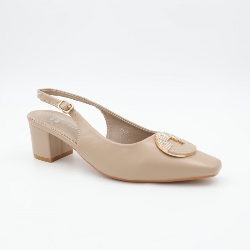 حذاء كعب متوسط نسائي بكعب عريض بتصميم مفتوح من الخلف لون بيج