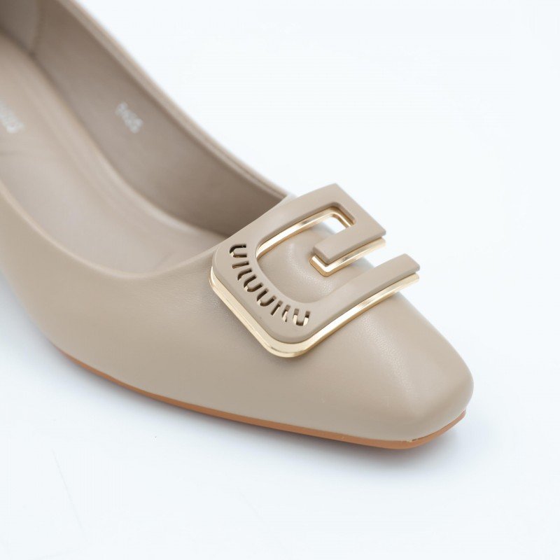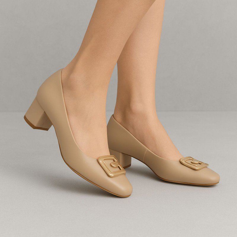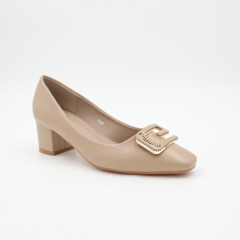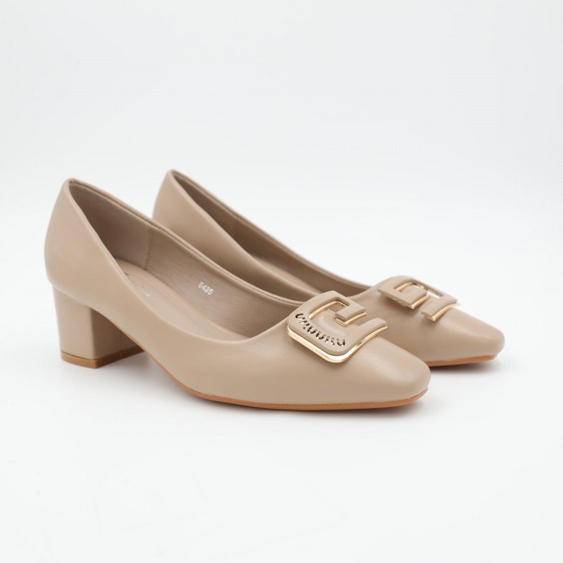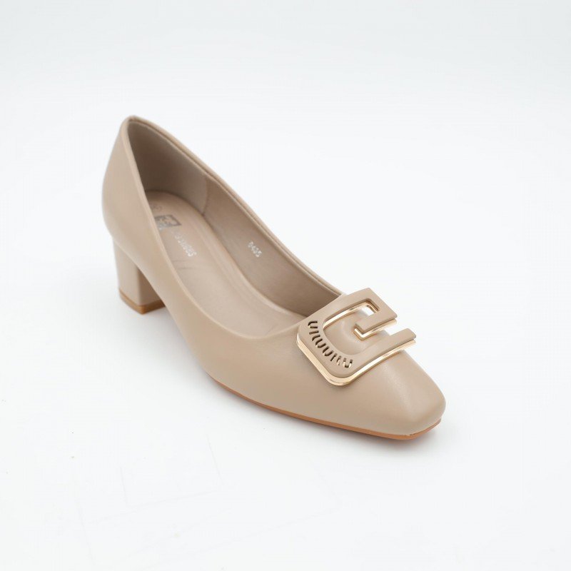 حذاء كعب متوسط نسائي بكعب عريض بتصميم لون بيج