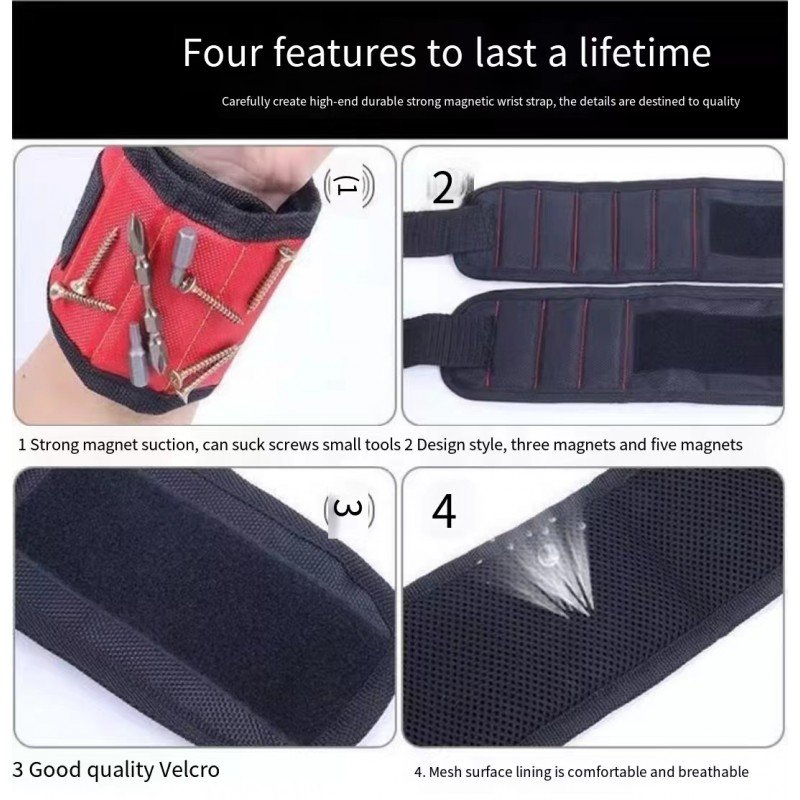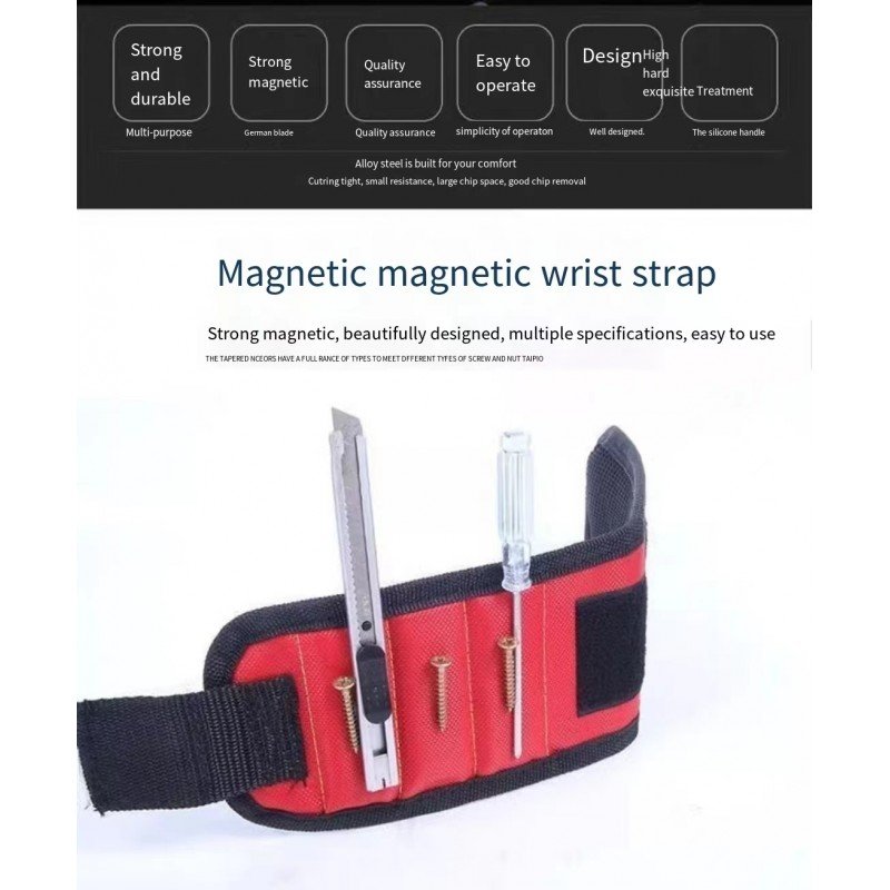 • حامل أدوات متعدد الاستخدامات: سوار المعصم المغناطيسي هذا ليس مخصصًا للبراغي والأظافر فحسب، بل يمكنه أيضًا حمل لقم الثقب، مما يجعله إضافة متعددة الاستخدامات لأي حقيبة أدوات.
