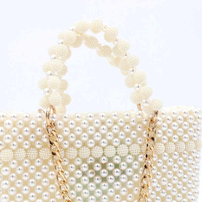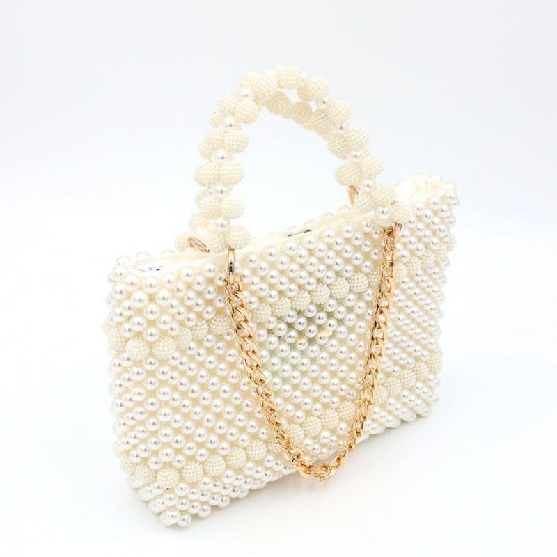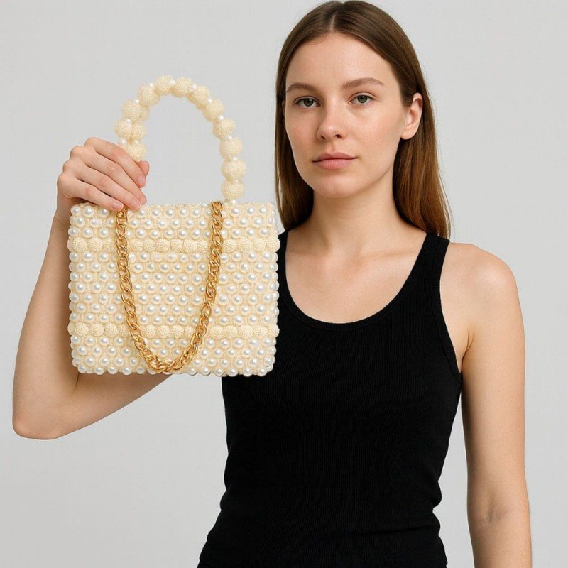 حقيبه خرز لولو لون اوف وايت مع بطانة داخلية لون اوف وايت تفاضيل ذهبي جيب داخلي عدد 3 مع سحاب داخلي وتسكيرة داخلية أبعادها قاعدة 22 سم الارتفاع 17سم العمق 6سم