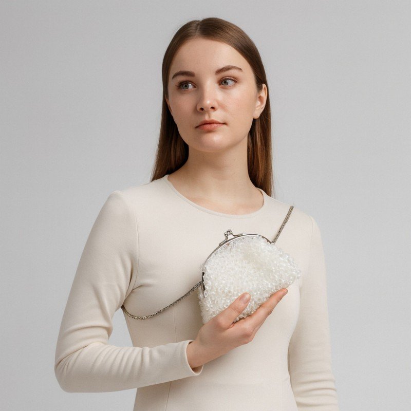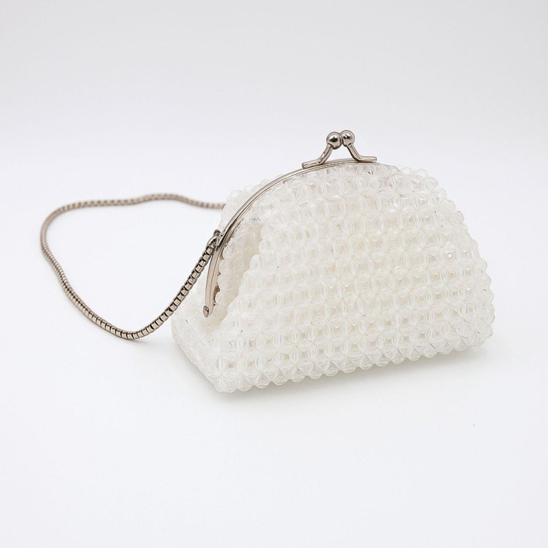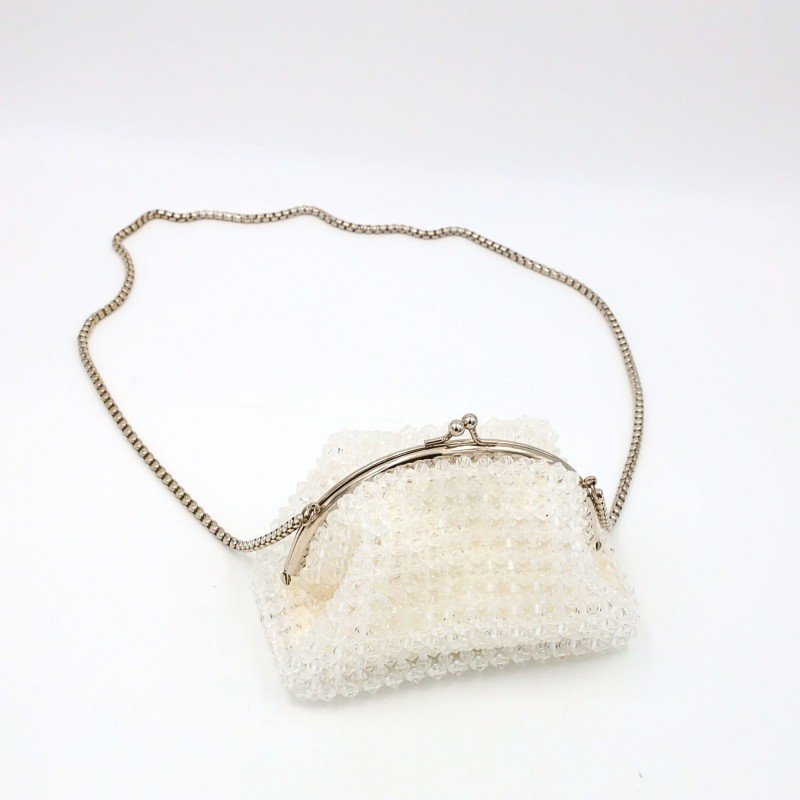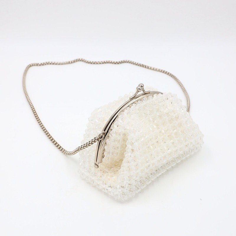 حقيبة خرز هرمي اللون شفاف مع بطانة أبيض والاكسسوار فضي حجم صغير مع جيب داخلي حجم 8 سم