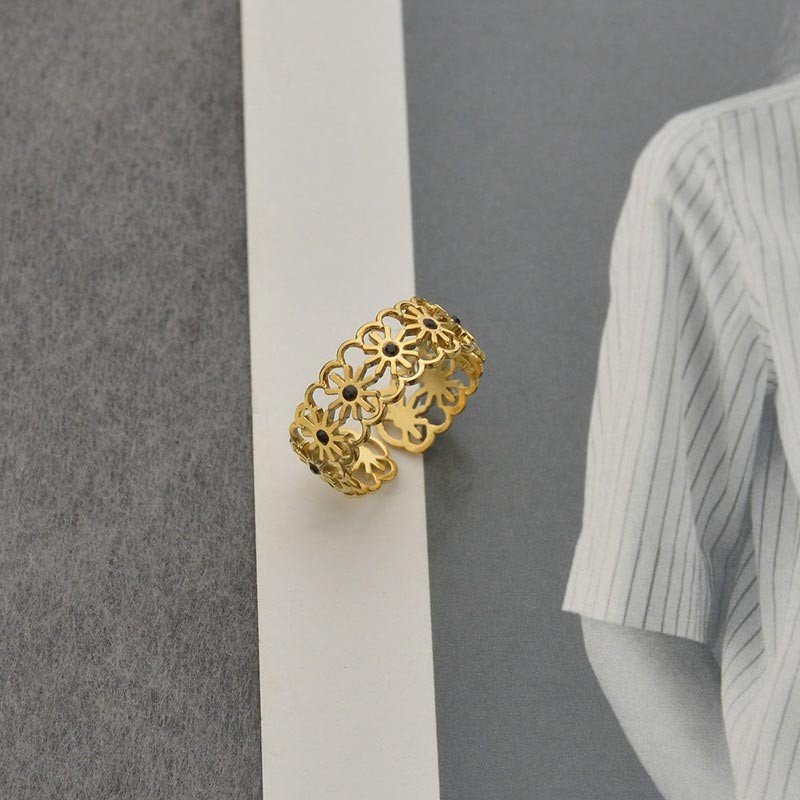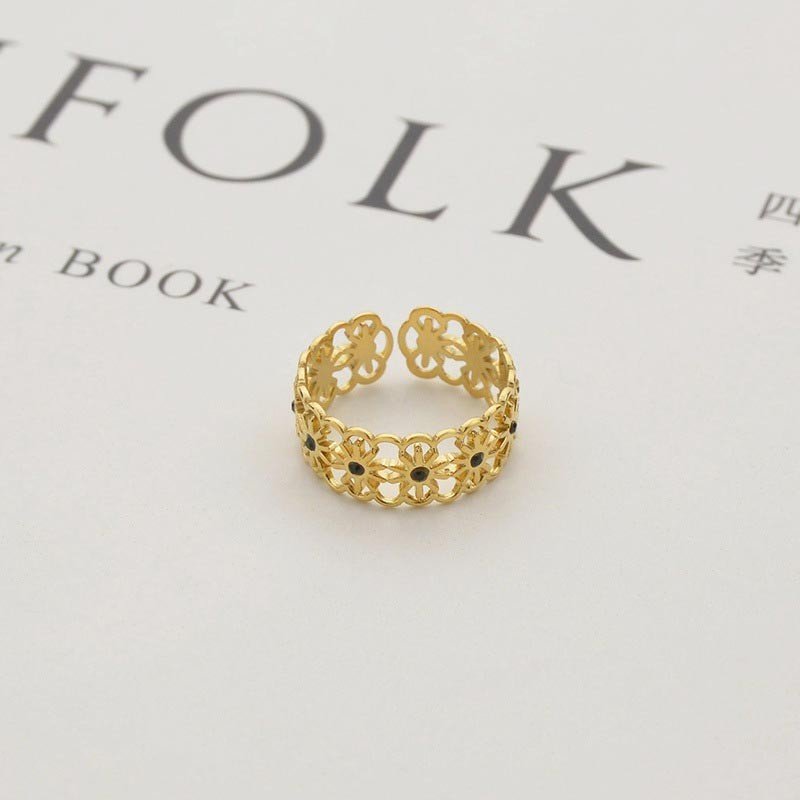 خاتم ذهبي بتصميم عريض مع أحجار سوداء