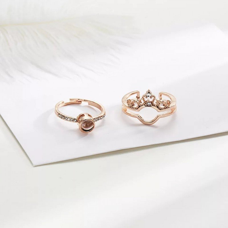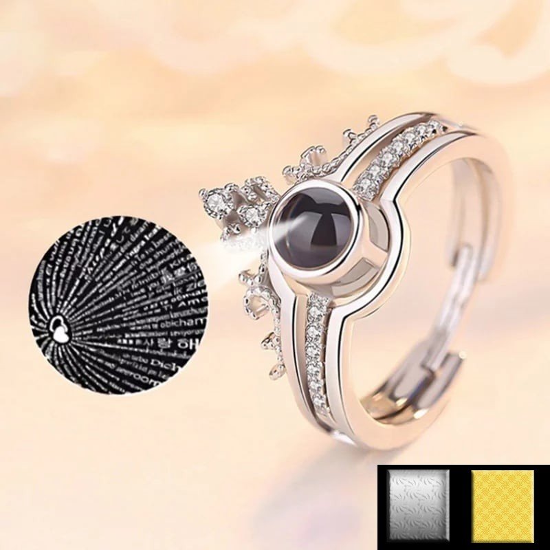 خاتم على شكل تاج قطعتين منفصلتين مع عدسة اسقاط ضوء تظهر كلمة أحبك مكتوبة ب100 لغة تاج الملكة الألوان : ذهبي و فضي