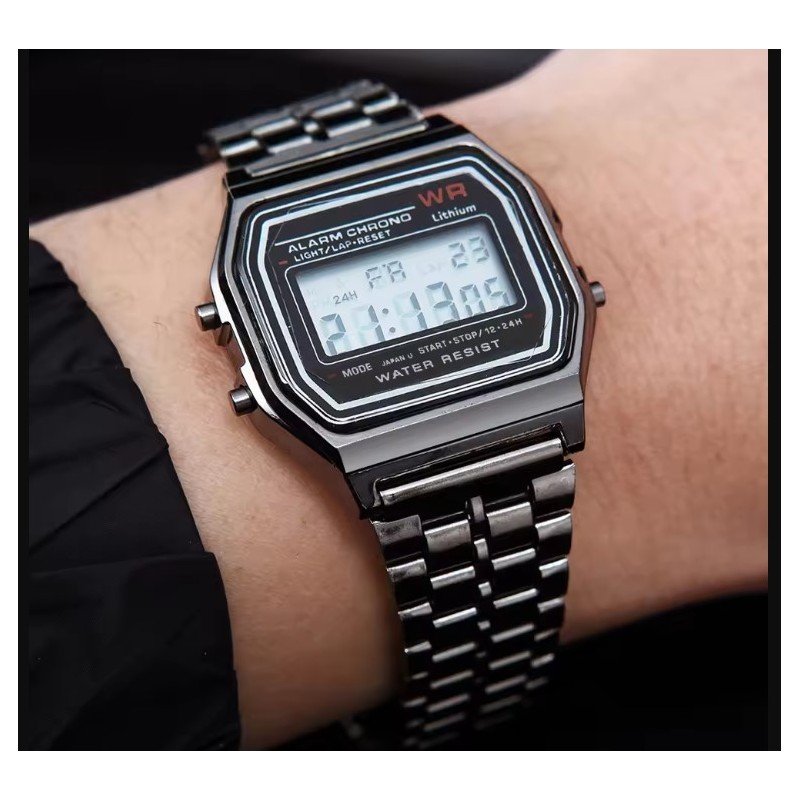 ✅ تصميم كلاسيكي أنيق مستوحى من الساعات القديمة مع لمسة عصرية تناسب جميع الإطلالات. ✅ هيكل معدني عالي الجودة باللون الفضي مع شاشة رقمية بإطار أسود تضيف مظهراً راقياً وجذاباً. ✅ عرض رقمي واضح للوقت والتاريخ مع منبه وساعة توقيت لتلبية احتياجاتك اليومية. ✅ مقاومة للماء في الاستخدام اليومي مثل الغسيل ورذاذ المطر (ليست مخصصة للغوص أو السباحة). ✅ سوار معدني مريح وقابل للتعديل ليتناسب مع مختلف أحجام المعصم. ✅ مثالية للاستخدام اليومي أو كإضافة أنيقة لإطلالتك الرسمية أو الكاجوال.