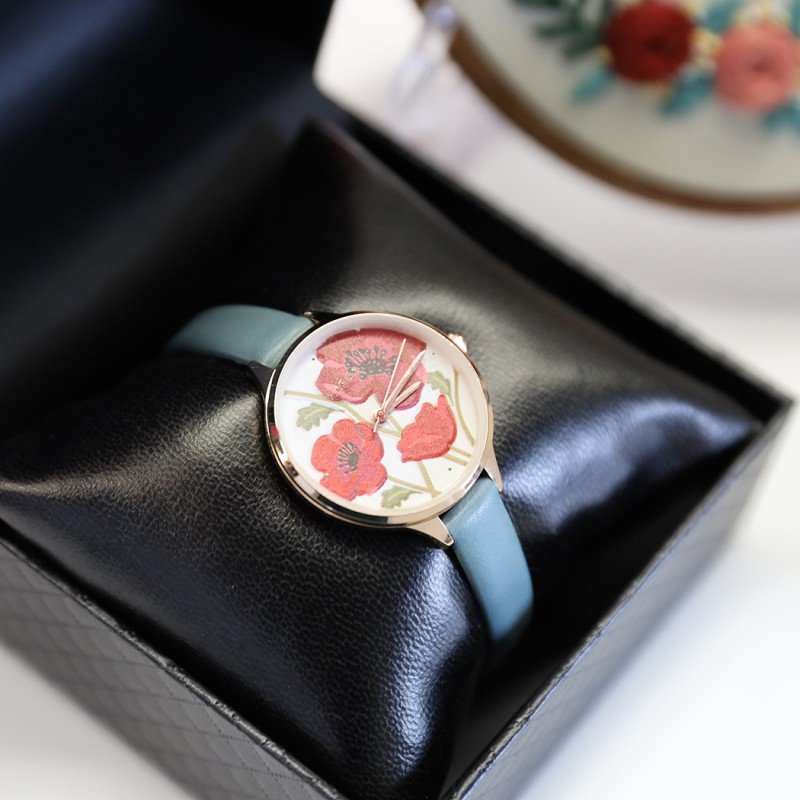 ساعة جلد ستاتية بتصميم مينا ورد من Nafisa – عقارب لون فستقي