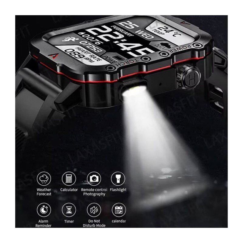 المميزات: 1. تصميم عسكري قوي ومتين:مقاومة للصدمات والغبار والماء، مثالية للاستخدام القاسي والأنشطة الخارجية مثل التخييم والرياضات.2. كشاف مدمج للإضاءة:مزودة بكشاف LED يساعدك في الإضاءة أثناء الليل أو في الأماكن المظلمة.3. مكالمات صوتية مدعومة بالذكاء الاصطناعي:إمكانية إجراء واستقبال المكالمات عبر البلوتوث مع مساعد صوتي ذكي لتسهيل التحكم بالأوامر.4. تتبع شامل للياقة البدنية:تتبع معدل نبضات القلب، الخطوات، السعرات الحرارية، وجودة النوم، مما يجعلها شريكًا مثاليًا لنمط حياة صحي.ملاحظة: هذه الساعة غير مقاومة للماء