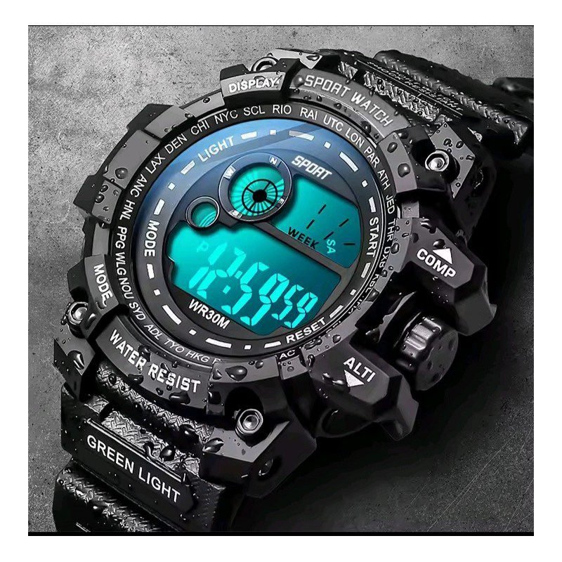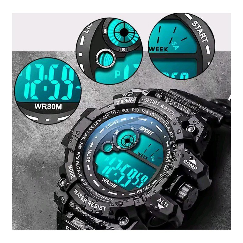 ساعة رياضية رقمية مع إضاءة LED جديدة للرجال مقاومة للماء – لون أسود مع ذهبي – موديل WR30