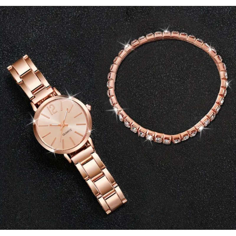 ساعة كوارتز فخمة للصبايا مع اسوارة مرصعة بالسترس اللامع – لون روز جولد