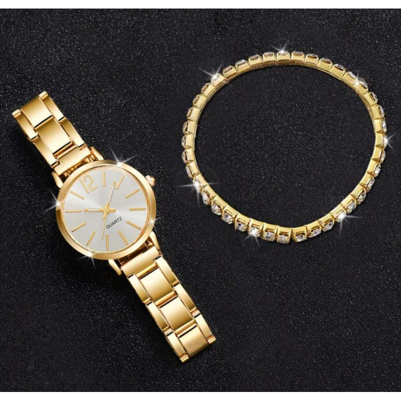 ساعة كوارتز فخمة للصبايا مع اسوارة مرصعة بالسترس اللامع – لون ذهبي